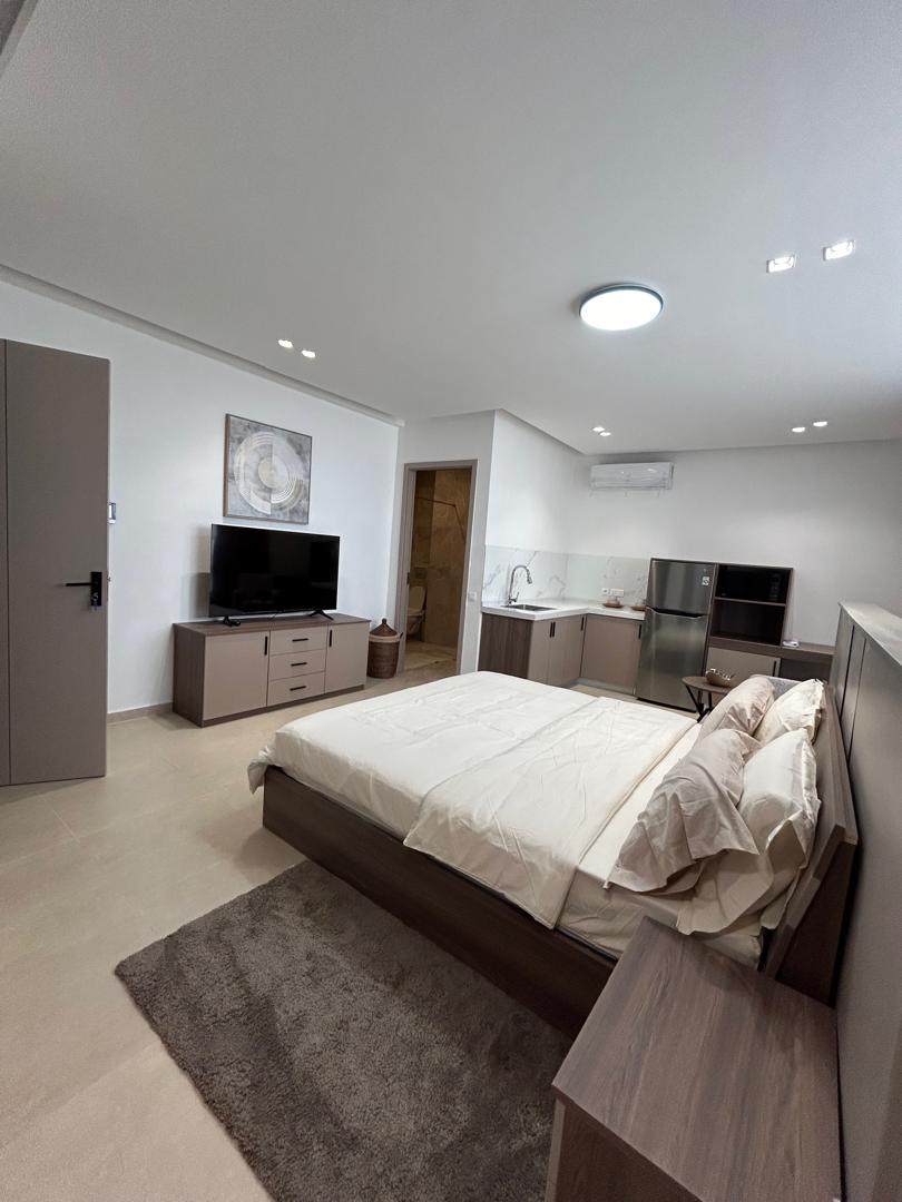 Brand new & elegant 1 bedroom+bath+kitchen space studio, with high end finishes. 24/7 security, video surveillance, generator, water pump, elevator, daily cleaning & electricity cost included. Room has fridge, AC, TV, Microwave & other appliances. Located on a central street in Mermoz at walking distance from restaurants, shops, Auchan Cite Keur Gorgui, and Olympic Club. At less than 5 minutes drive to Sea Plaza shopping mall, Auchan Mermoz. And 15 minutes to downtown and Almadies.