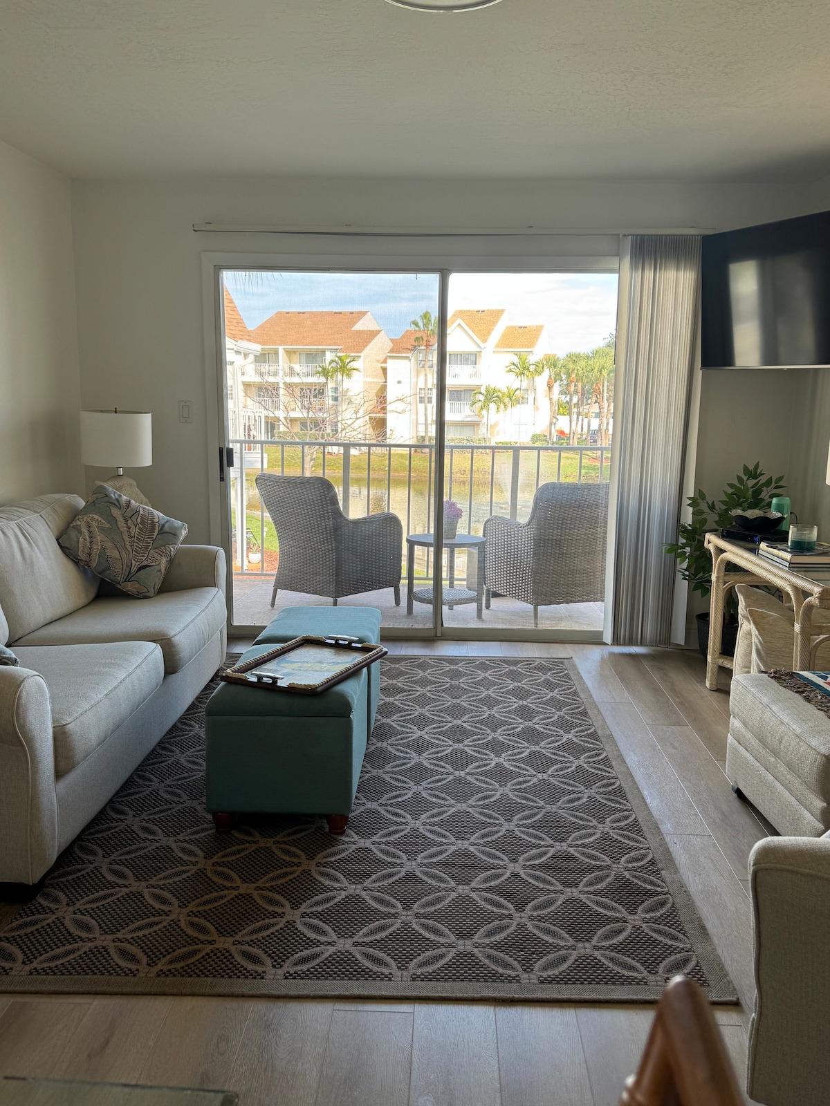 Beautiful 2 Bedroom, 2 Bath Condo on first level. Condo has a water feature and a partial pool view. Unit newly updated. New Front door, Patio Slider, paint and flooring. Condo is completely stocked for cooking your favorite meal. We love this space and the condo being so centrally located on beachside! Green Turtle grocery is just steps away from our unit. Bagle shop and a Starbucks just across the street. Many other restaurants, grocery stores and beach, just a short walk away!