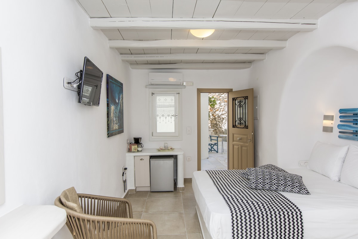 Outstanding traditional greek island appartments with 360 view of the sunset sea, 3 min. walking distance from the main beach of the island, close to restaurants. Ideal for couples. One bedroom, Built-in kitchen fully equipped with modern equipment. It is stressed that the apartment is completely autonomous (separate entrance & covered balcony, no shared spaces & facilities). There is no risk of COVID infection and strict cleaning and disinfection is done after checking out.