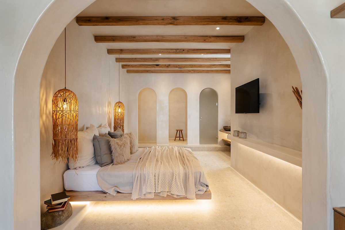 Nested in Naxos Town with stunning views out to the Aegean Sea we offer out guests the opportunity of an exclusive upretentions relaxing experience. Within easy reach from island’s famous PORTARA and Venetian Castle. Our philosophy is to offer first-rate hospitality coupled with unrivaled privacy. Much more than a home our deluxe suite offers supreme comfort combined with elegance style and unique Greek hospitality. it’ s warm minimal lines create a relaxing atmosphere.