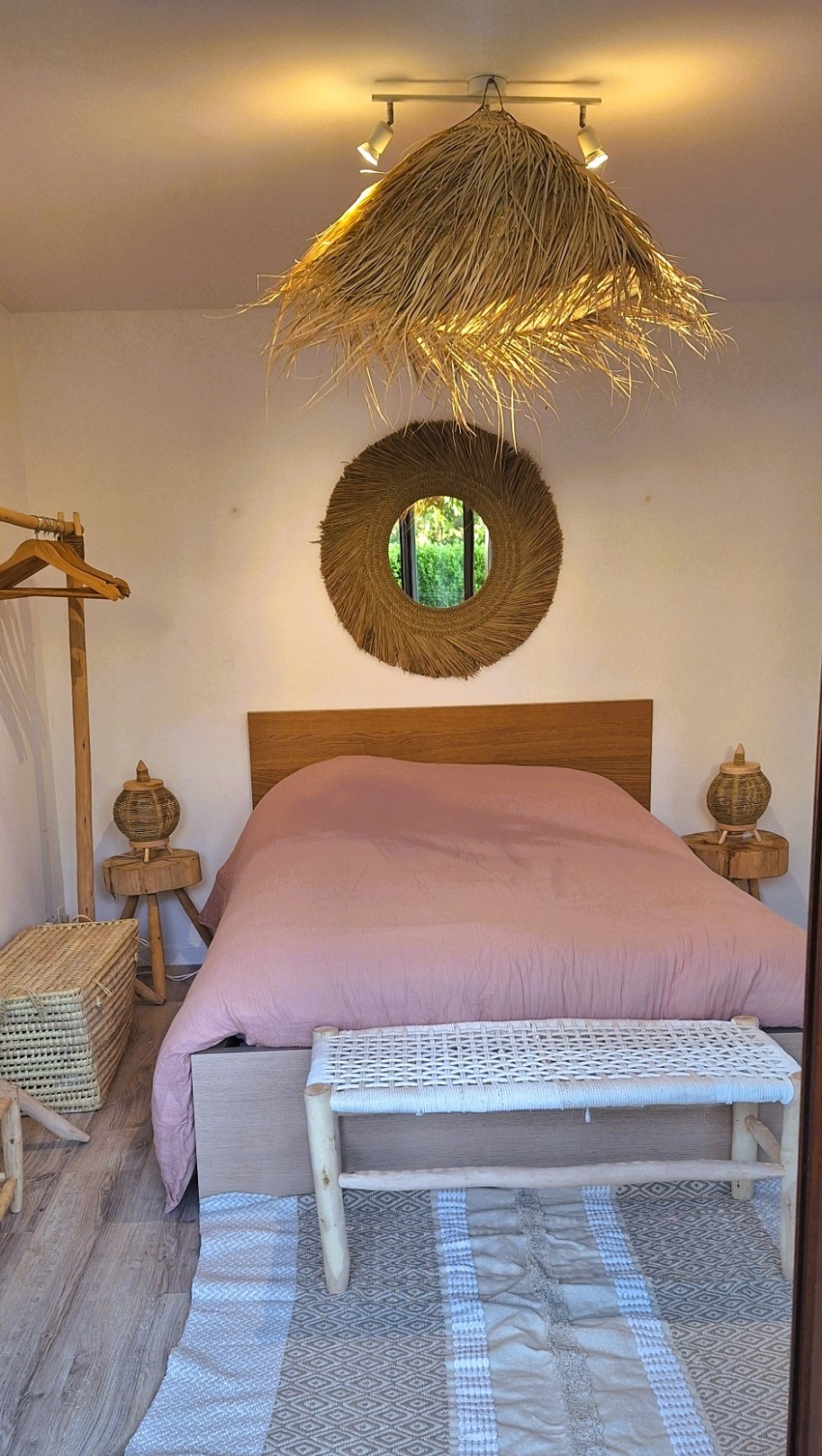 Jolie dépendance au calme avec petite chambre, séjour avec canapé convertible pour dépannage, mise à disposition d'un micro-ondes, cafetière, bouilloire, grille pain, frigo pour vos petits déjeuner. Bien qu'il n'y ai pas de cuisine une terrasse plein sud privative avec son jardinet et un barbecue vous permettront de prendre vos petits déjeuner et vos repas improvisés en toute quiétude. Le linge de lit et de toilette est fourni. Je peux vous proposer gracieusement 2 vélos pour vos balades.