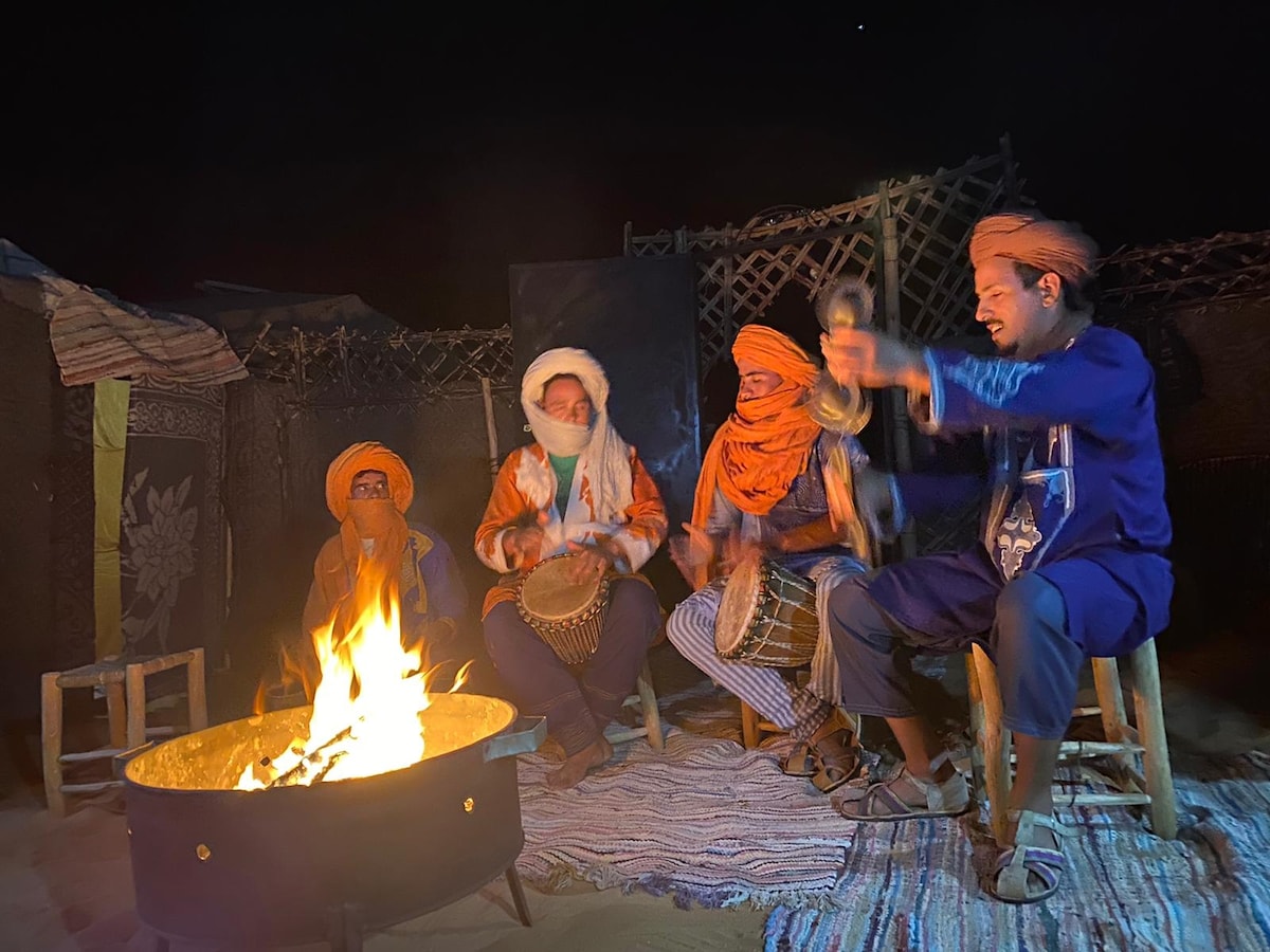 our camp is in (Hassilabied) dunes of Erg chebbi desert, when you arrive to Hassilabied) you will park your car at our house we have privat parking and we have house for guest where they can have tea for hospitality. and perpare back bags for the night in the desert camp, you will have 1hour camel ride to wach sunset over sand dunes then get down to the camp you will have dinner and camp fire berber music.