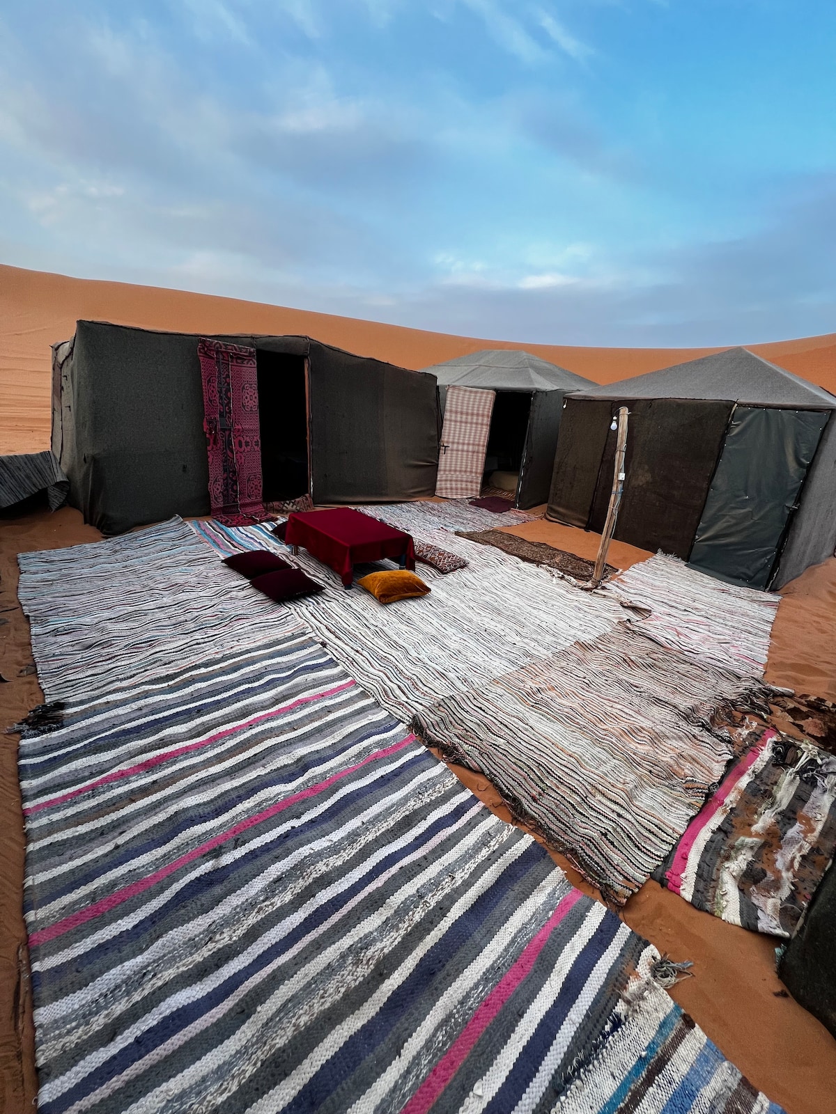 our camp is in (Hassilabied) dunes of Erg chebbi desert, when you arrive to Hassilabied) you will park your car at our house we have privat parking and we have house for guest where they can have tea for hospitality. and perpare back bags for the night in the desert camp, you will have 1hour camel ride to wach sunset over sand dunes then get down to the camp you will have dinner and camp fire berber music.