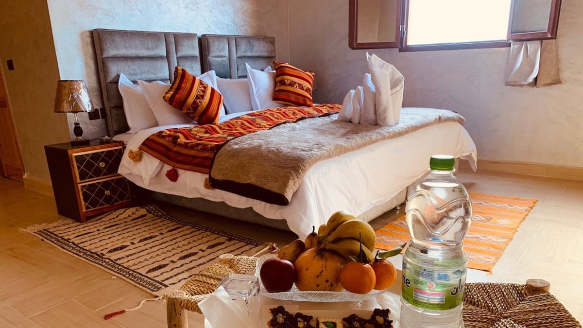 Bienvenido al Riad Akabar Merzouga 🌴 Un lugar único que combina la auténtica hospitalidad marroquí con la magia del desierto, donde reina la tranquilidad, abundan los cielos despejados y las doradas arenas de Merzouga se extienden hasta donde alcanza la vista. Este riad ofrece una experiencia inolvidable, tanto si buscas relax como aventura. Disfruta de impresionantes amaneceres y atardeceres entre las dunas y pasa noches tranquilas bajo las estrellas del desierto.