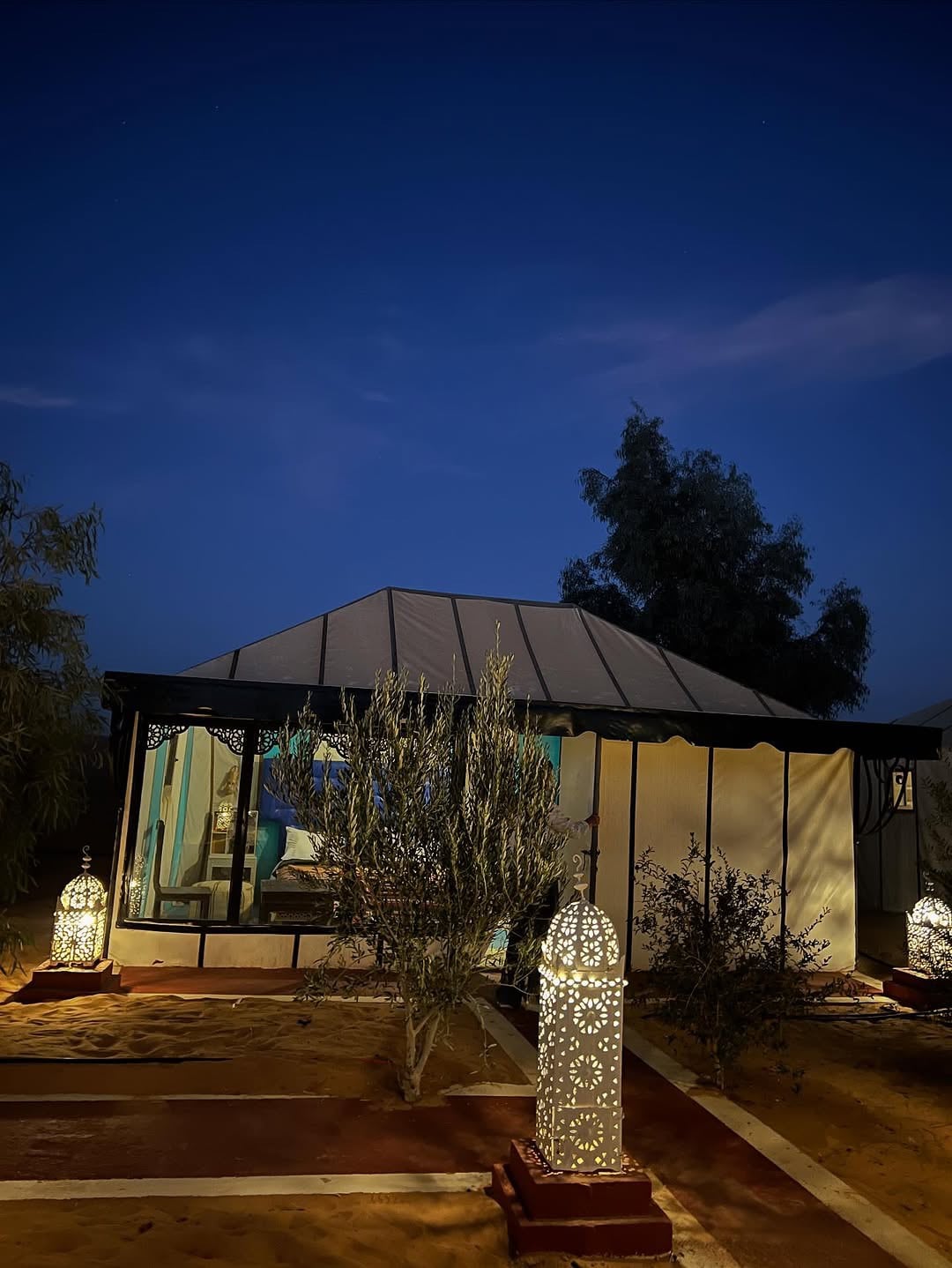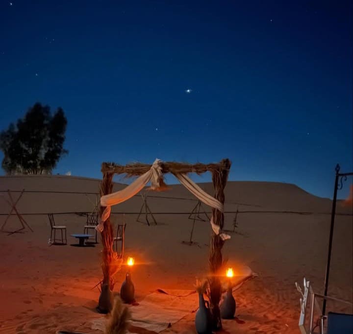 My luxury tent in Merzouga is an extraordinary oasis nestled amidst the mesmerizing dunes of the Sahara Desert. Surrounded by breathtaking landscapes, this unique accommodation offers unparalleled views of golden sands stretching as far as the eye can see. Inside, my spacious tent is adorned with exquisite Moroccan decor and equipped with all modern comforts—plush bedding, a private bathroom with hot water, and air conditioning for those warm desert nights.