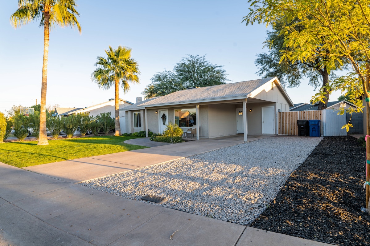 Welcome to Tempe! This 2BR/1BA home has everything you need for a relaxing stay. Fully equipped with dimmable smart lighting and speakers in every room, with a recently remodeled kitchen and bathroom that boasts a spa-like experience in the soak tub, in-unit laundry, high speed internet, 86in 4K TV (all major streaming and 300+ movie collection, with 5.1.4 surround) included and a private back yard, this home is perfect for either a quick trip to the city, movie night, or backyard daycation!