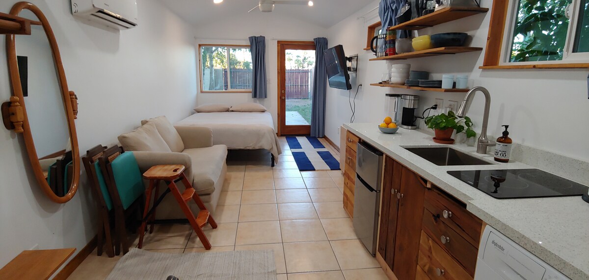 This cozy 160sf tiny home/guest house will certainly be memorable. Enjoy this very private setting steps away from the pool available for your use. Sofa Hide-a-bed pulls out and can accommodate up to two adults. Private bathroom with toilet and hot shower just for you. Kitchenette includes mini fridge, microwave and coffee pot. Wifi and TV with streaming subscriptions and Heat/Air Conditioning.