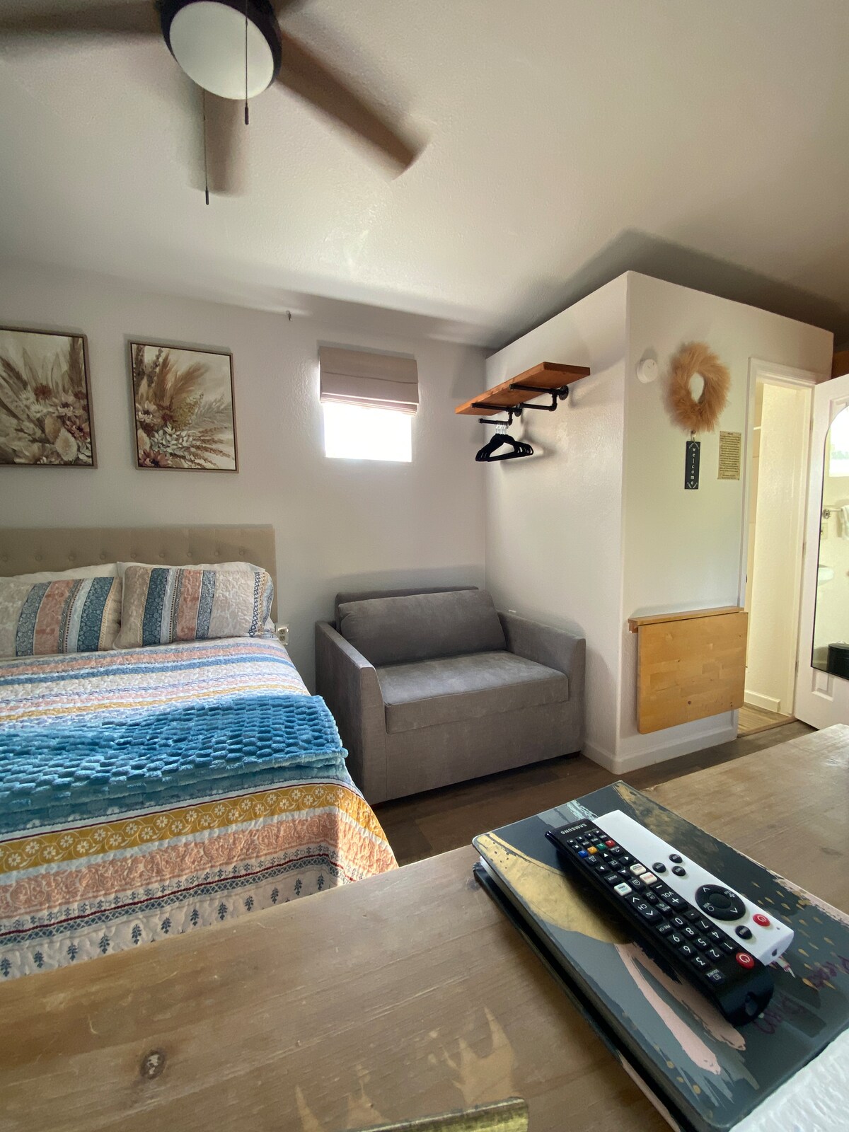 You'll feel right at home staying in our tiny 220 sq ft guest house. This is a studio with all the comforts of home. Private bath and kitchenette. It offers a comfortable full-size bed. Large Smart TV. Comfortable love seat with pull-out twin bed. Free Wifi. We are close to all the Hospitals, Shopping malls, Downtown Gilbert nightlife life and the Riparian Preserve @ Water Ranch.