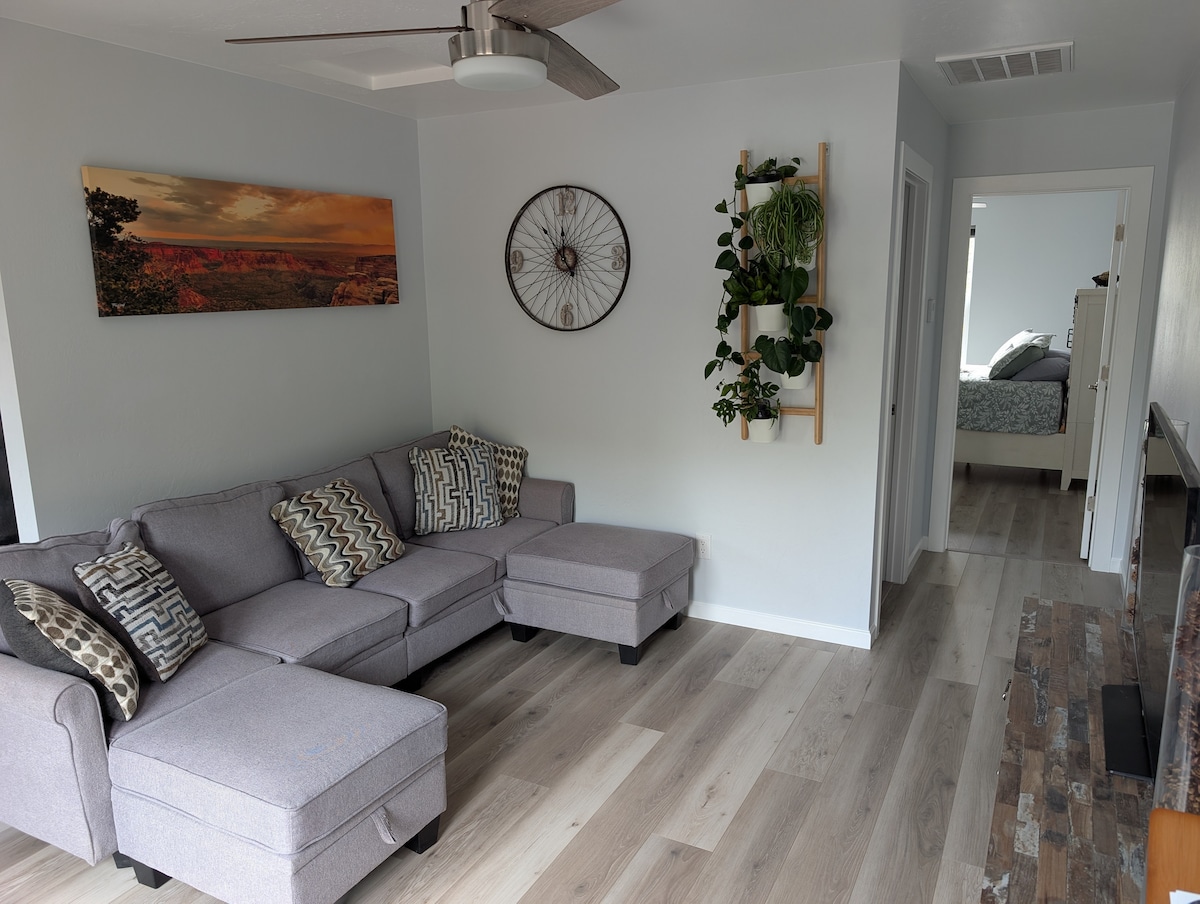 Recently remodeled suite in the lower level of my home! Great for long term traveling Medical Professionals! Private Bedroom/Living Room/Bathroom Suite in a convenient GJ location. Unique house, (Frank L Wright 'Usonian House'), wall of windows, suite opens to sub-level yard & patio. Close to CO Mesa Univ & St Mary's Hospital. Wi-fi, queen bed, desk, off street parking, and private entrance. Restaurants, shops & activities nearby. Using safe Covid practices! Accept guests over 25 yrs only.