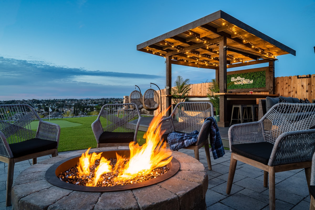 Perched high above the city with breathtaking views of the Coronado Bridge and downtown, this 3-bedroom oasis was built for unforgettable memories. Casa La Vista is a stunning hilltop retreat with panoramic views of downtown San Diego and the Coronado Bridge. Unwind in the jacuzzi, sip cocktails or enjoy sunset vibes by the fire pit. Features a putting green, cornhole, coffee nook, and sleeps 10. Perfect for families, friend getaways, or host-approved events. Just minutes from downtown & beaches