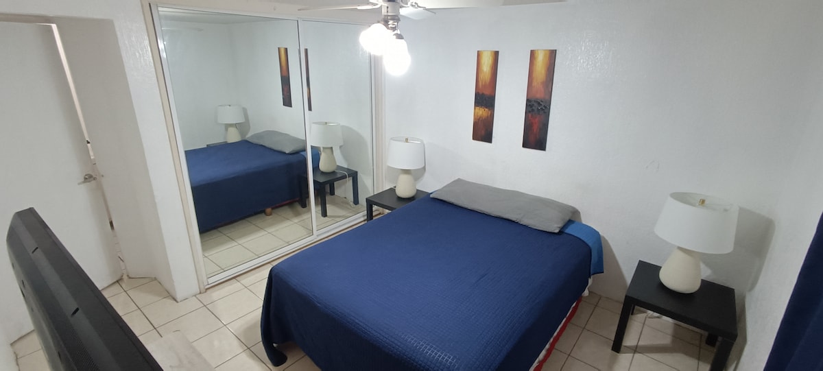 Estamos a 2 calles de unn Mini Super Mercado de aqui. También a 2 calles hay muchas otras cosas como el Costo, panadería , cafeterías , restauran , farmacia y puestos de comidas en las esquinas. Cuento con toallas, colchas, utensilios de cocina y todo lo básico de un hogar. Usamos DOBLE sábanas y fundas. Con área para fumar. Área de trabajo.