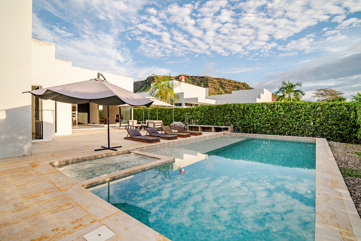 Fantastic place to relax with a breathtaking mountain view! Recently upgraded with an additional bedroom and almost fully renewed, the house is located in a condominium with a golf course, clay tennis courts and hiking paths crossing a river. A quiet place, at about 2 hours drive from Bogota. Private pool, BBQ, jacuzzi. NOTE: The capacity of the house is 16 people in total For Easter (Semana Santa), we request a minimum stay of 7 nights, and for year-end (Christmas, new year's eve) as well