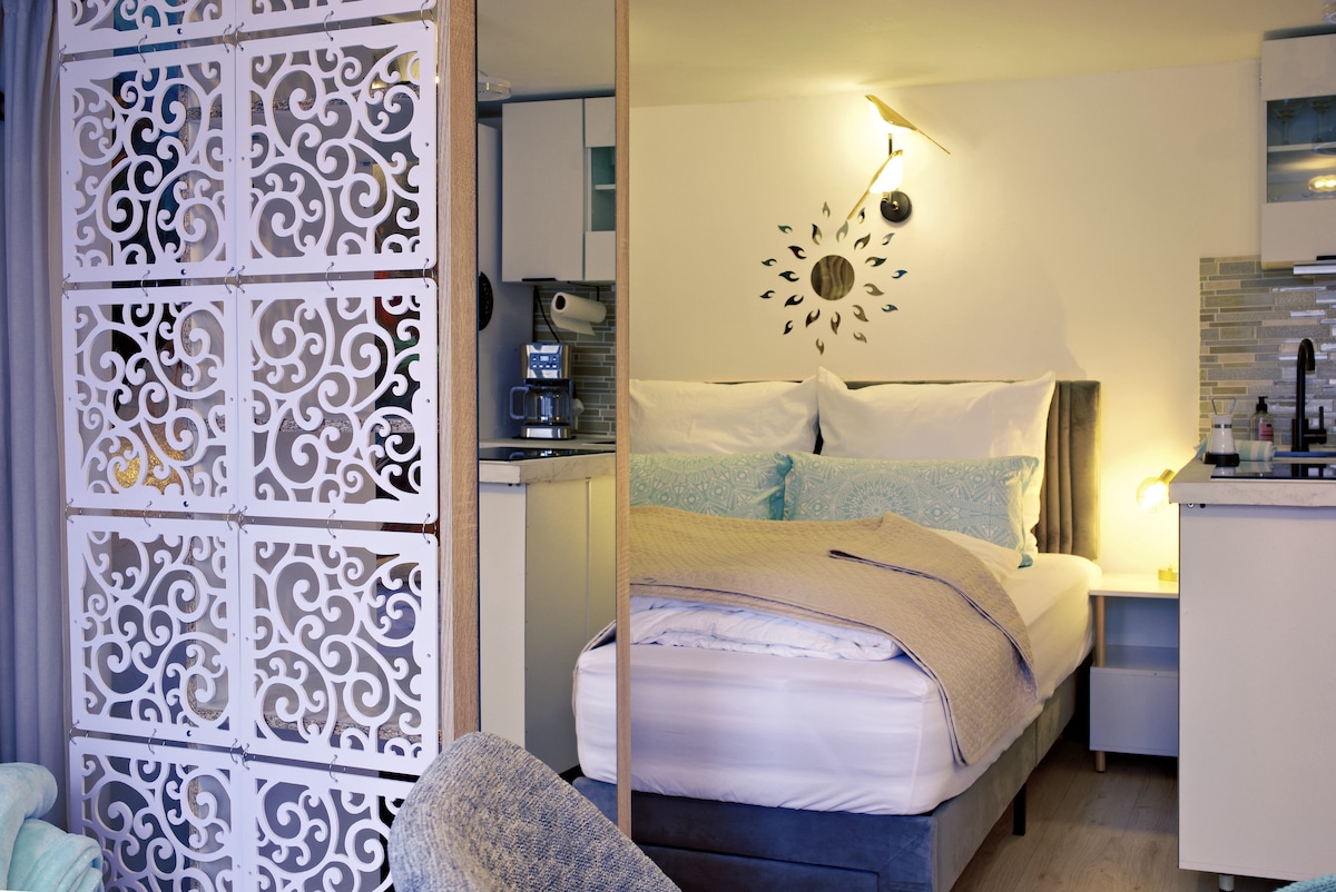Diese besondere Unterkunft hat einen ganz eigenen Stil. Das innovative und funktionale Design ermöglicht alle Annehmlichkeiten und bietet maximum Komfort auf nur 18qm. Eine vollausgestattete Küche, schnelles Internet, Smart-Tv runden die exklusive Einrichtung ab. Sie parken kostenlos direkt vorm Haus. Aus den Süd-Fenstern haben unsere Gäste einzigartigen Blick über die Stadt. Das Stadt-Zentrum ist wenige Gehminuten entfernt. Das Blinden- & das Seniorenheim "Blickpunkt" sind direkt um die Ecke.