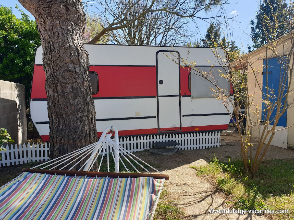 Caravane familiale confortable pour 4 personnes avec auvent, terrasse, table de jardin, barbecue. Située dans un hameau typique oléronais, Grésillon, dans un jardin familial bordé de vigne, à proximité d'un bois et de pistes cyclables par les marais pour aller aux grandes plages de Vert bois et Grand Village à une quinzaine de minutes. Cuisine fonctionnelle et salle de bain de caravane avec douchette et WC. Parking. Toilettes sèches extérieures et douche solaire extérieure.