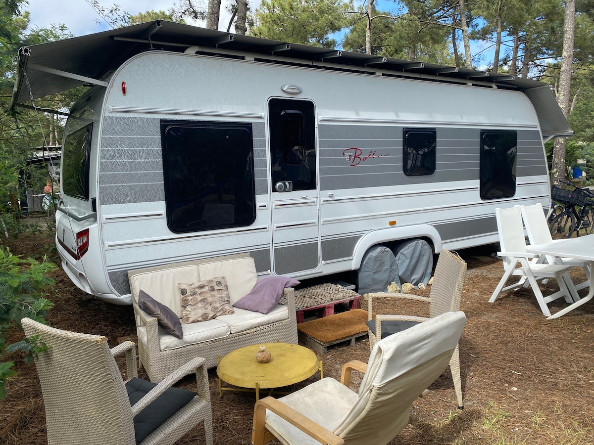 Laissez-vous bercer par les sons de la nature dans ce logement unique à 2 pas de l’océan au sein du cadre idyllique du camping naturiste du CHM (Centre Helio-Marin) Le logement Caravane Bellini de 6,20m de 2016 très bien entretenue. Située dans un quartier très calme (Sables 1594). Elle est composé d’une vraie chambre avec un lit deux places de 140 de largeur. Possibilité de transformer la banquette du salon en lit deux places. La cuisine est bien équipée et la caravane très bien climatisée