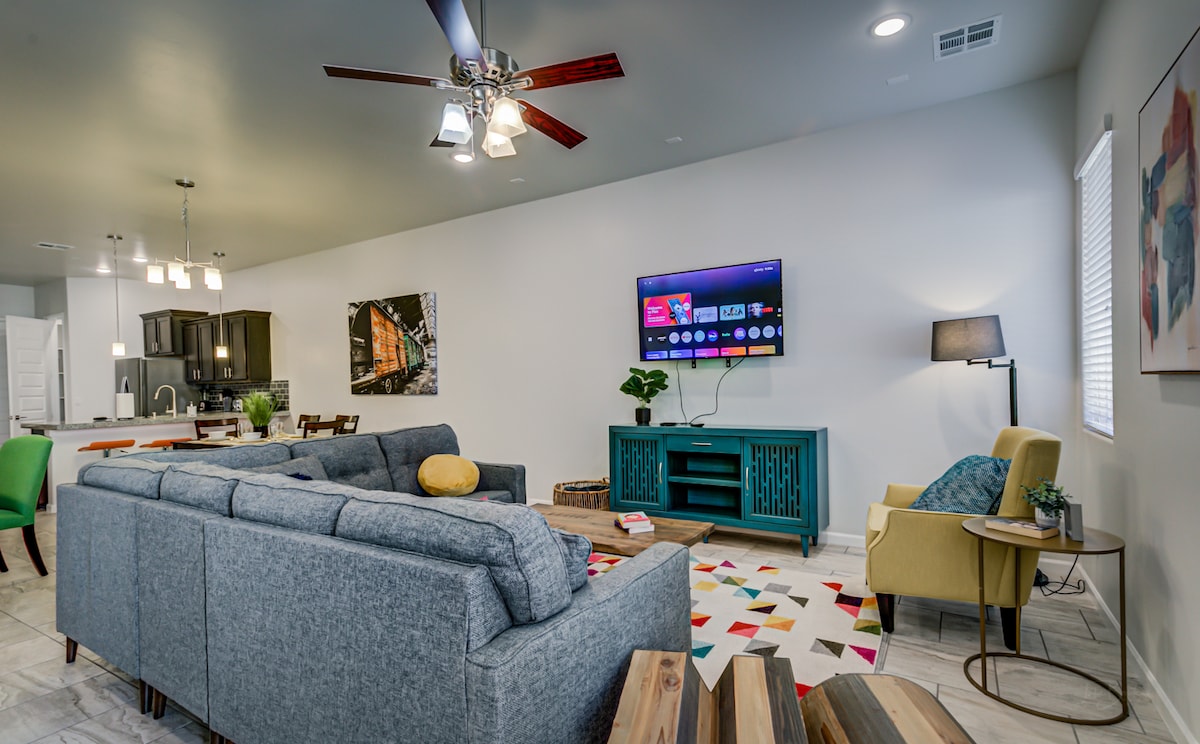 This fully-furnished modern home is perfect for weekend getaways or longterm stays. With latest in appliances and style, the Powder River Villa offers the comfort of home with a luxury feel. Stream Netflix in front of the stacked stone fireplace, decompress in the pebble rain shower, or simply relax on the back porch to the beautiful New Mexico sunsets. This stylish space can be the romantic escape you're seeking or comfortably fit your group of 7.