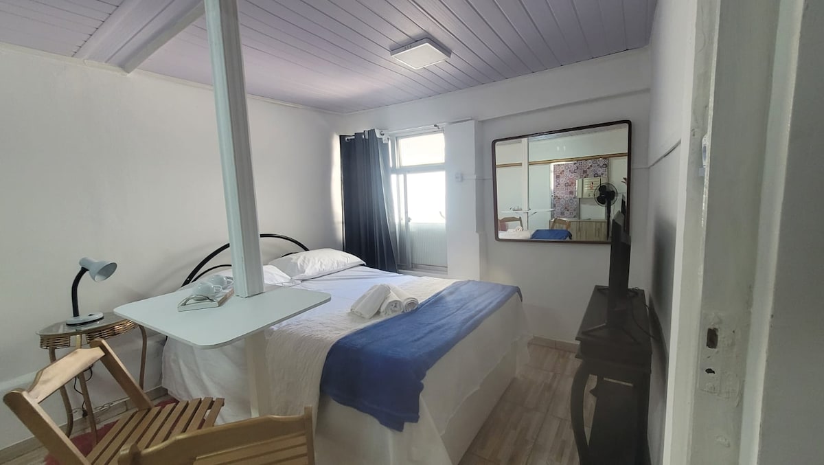 Fully equipped cosy & vast bungalow, small kitchen and gorgeous view, set in a private garden with independent entrance. Our Colonial property is surrounded by a tropical garden and located in a bucolic street in the center of Santa Teresa. It is ideal for a couple but we can ad an extra bed. We also have a small private room up on demand on the same garden area. 40Gb cable Wifi