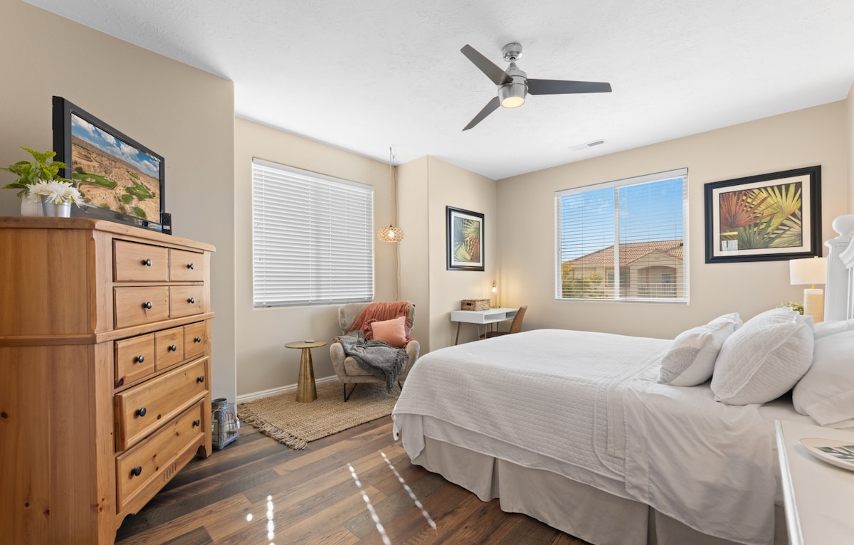 Escape to our completely renovated spacious retreat, perfect for six! Unwind and rejuvenate by the lush pool after a morning biking the Virgin River bike path, enjoying a desert UTV adventure, or playing a round of world-class golf. The airy kitchen invites your culinary creations or savor local eats. Relax with a drink on the balcony, and after sunset, enjoy peaceful slumber on crisp cotton sheets. Our haven awaits you—your ideal home away from home.