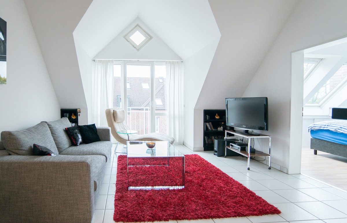 Wir vermieten diese schöne Dachgeschosswohnung in Düsseldorf. 55qm, in absoluter Rheinnähe im Stadtteil Golzheim. Es ist eine Maisonettewohnung über zwei Ebenen in einem sehr gepflegtem Haus und in einer ruhigen Straße. Die Messe ist fussläufig erreichbar. Flughafen 10 Minuten mit dem Taxi, Bahnhaltestelle 2 Minuten. Die Wohnung ist mit zwei gemütlichen Boxspringbetten von Dormastyle ausgestattet.