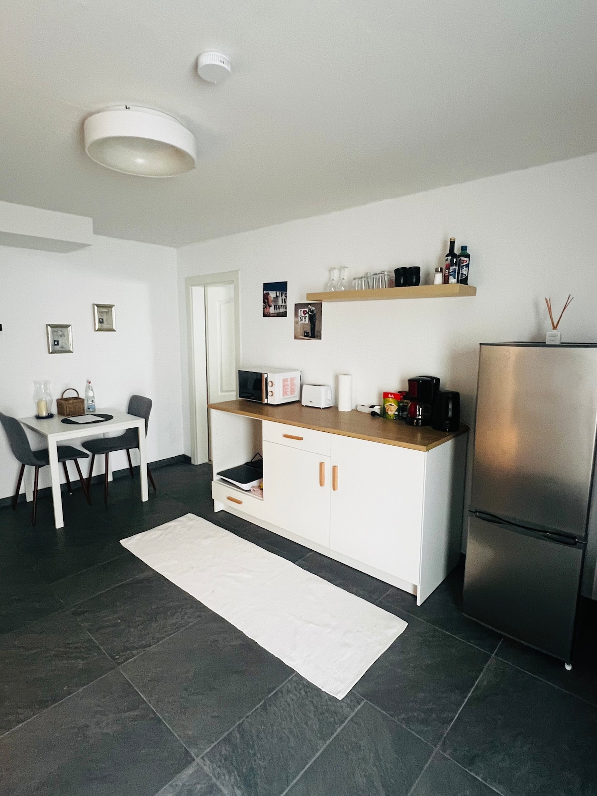 Das Apartment liegt direkt am Rhein in Oberkassel auf der ruhigen, kühlen Gartenseite. Es ist für längere Aufenthalte voll ausgestattet und mit Kunst und Möbeln hochwertig eingerichtet. Das neue luxeriöse Bad hat eine ebenerdige Regen-Dusche und die separate Küche einen Essplatz für 4 Personen. Der kombinierte Wohn-/Schlafraum verfügt über Doppelbett, Schlafsofa, Babybett, großen Schrank, Schreibtisch, Smart-TV und Stereoanlage. Parken ist kostenfrei möglich, E-Ladestation 50m entfernt.