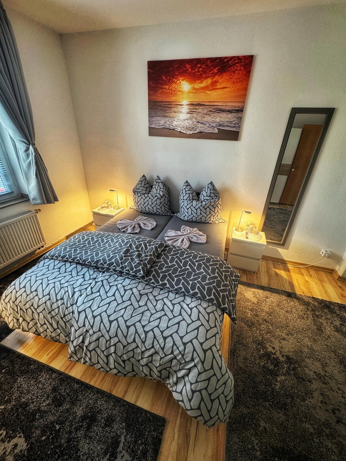 Luxuriöses Boutique-Appartement 2 PAX, sehr nah an der MESSE Düsseldorf/ ARENA ( 600m Fußweg) NON SMOKING. 50 qm. 1 Schlafzimmer mit hochwertigem Bett 160x200, Durchgangszimmer mit Comfort-Single-Bett 90x200, Daunenbetten, Mako-Satin-Bettwäsche. Küche, Bad, extra Gäste-WC, Parkettböden, hochwertige Ausstattung. Zweite Wohnung im Haus verfügbar