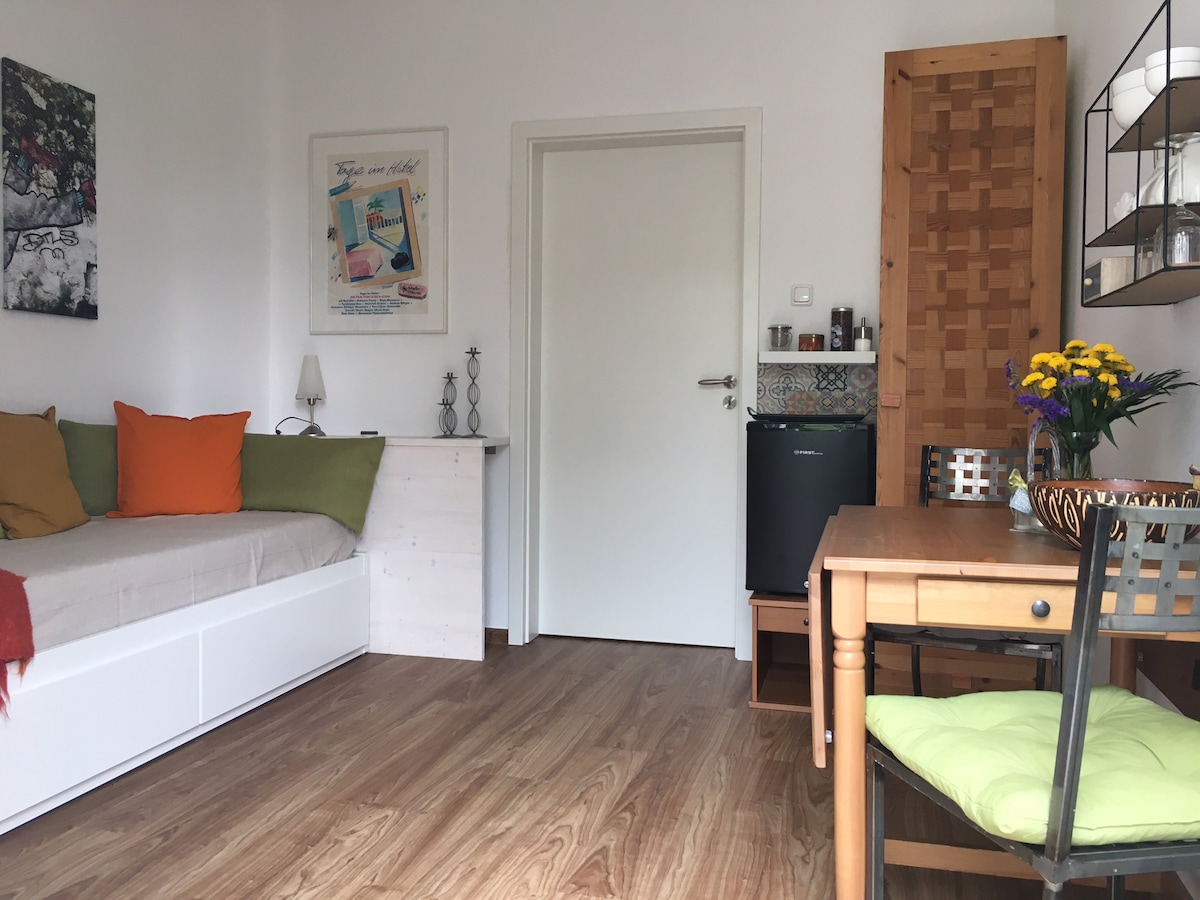 Wir vermieten unser kleines Gästezimmer (... es ist EIN Zimmer, auch wenn airbnb bei den Bildern Wohnzimmer und Schlafzimmer getrennt aufführt) mit eigenem Bad und Eingang. Das Zimmer hat ein Bett 80x200 cm, das sich schnell auf 160x200 cm verbreitern lässt. Das Zimmer hat zwar „nur“ ca. 13qm (plus Bad), aber sonst alles was man für einen kurzen Aufenthalt benötigt: einen Schrank, 2 Stühle, einen Tisch, Kühlschrank, die Möglichkeit Kaffee und Tee zu kochen... Tassen, Teller, Besteck ...
