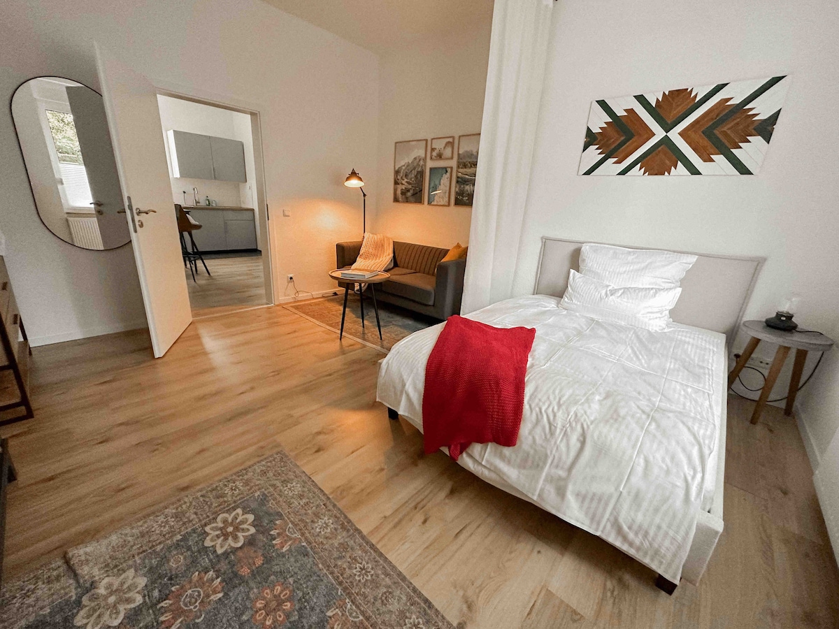 Modern, high-quality furnished 28sqm apartment for two people in the heart of Rüttenscheid. The district is known for its diversity, restaurants and bars and is characterized by its central location. The apartment offers everything you need for a stay in Essen: a comfortable bed (160cmx 200cm), Netflix & Amazon Prime, a fully equipped kitchen and a cozy dining area. The apartment is located to the back out to a green & quiet backyard.