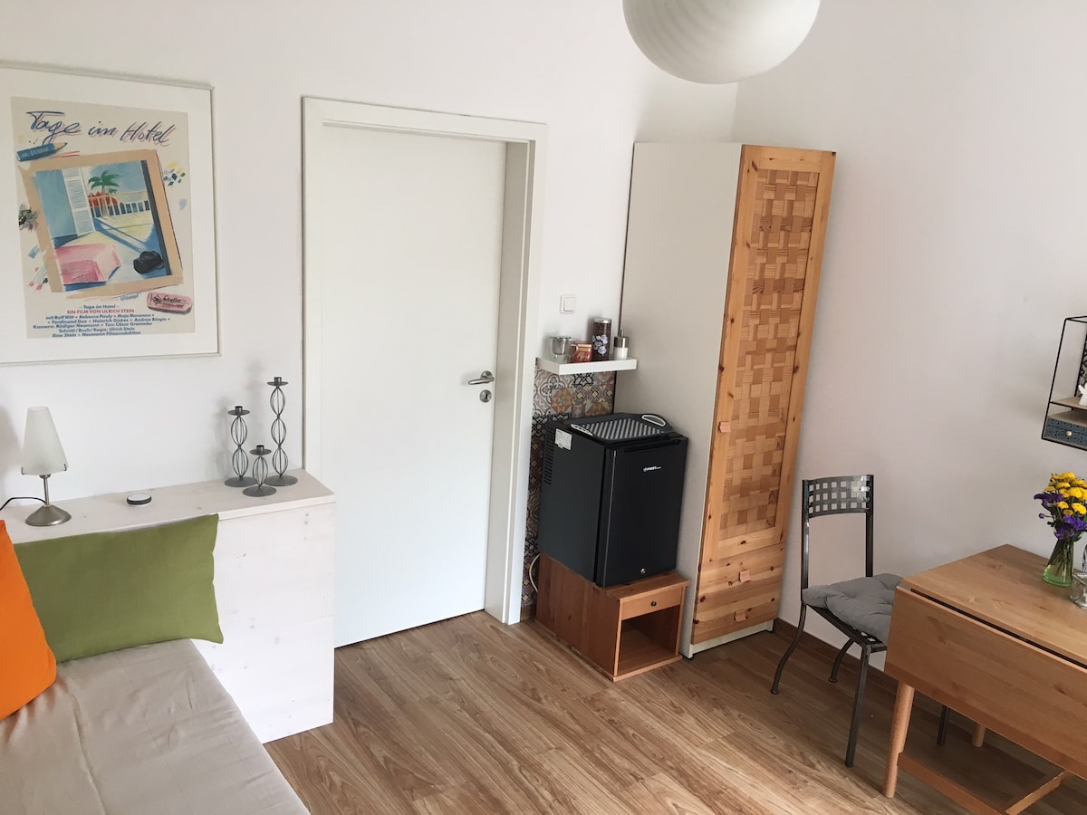 Wir vermieten unser kleines Gästezimmer (... es ist EIN Zimmer, auch wenn airbnb bei den Bildern Wohnzimmer und Schlafzimmer getrennt aufführt) mit eigenem Bad und Eingang. Das Zimmer hat ein Bett 80x200 cm, das sich schnell auf 160x200 cm verbreitern lässt. Das Zimmer hat zwar „nur“ ca. 13qm (plus Bad), aber sonst alles was man für einen kurzen Aufenthalt benötigt: einen Schrank, 2 Stühle, einen Tisch, Kühlschrank, die Möglichkeit Kaffee und Tee zu kochen... Tassen, Teller, Besteck ...