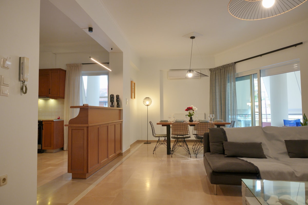 A fully equipped nest (50sq.m) that offers a pleasant and comfortable stay.Ιt is a 10min walk to the city center, the beach and 5 min walk to the beautiful marina.There is a private parking lot and within 1min you will find the Municipal Railway Park,S/M,bus stop,pharmacy and bakery.