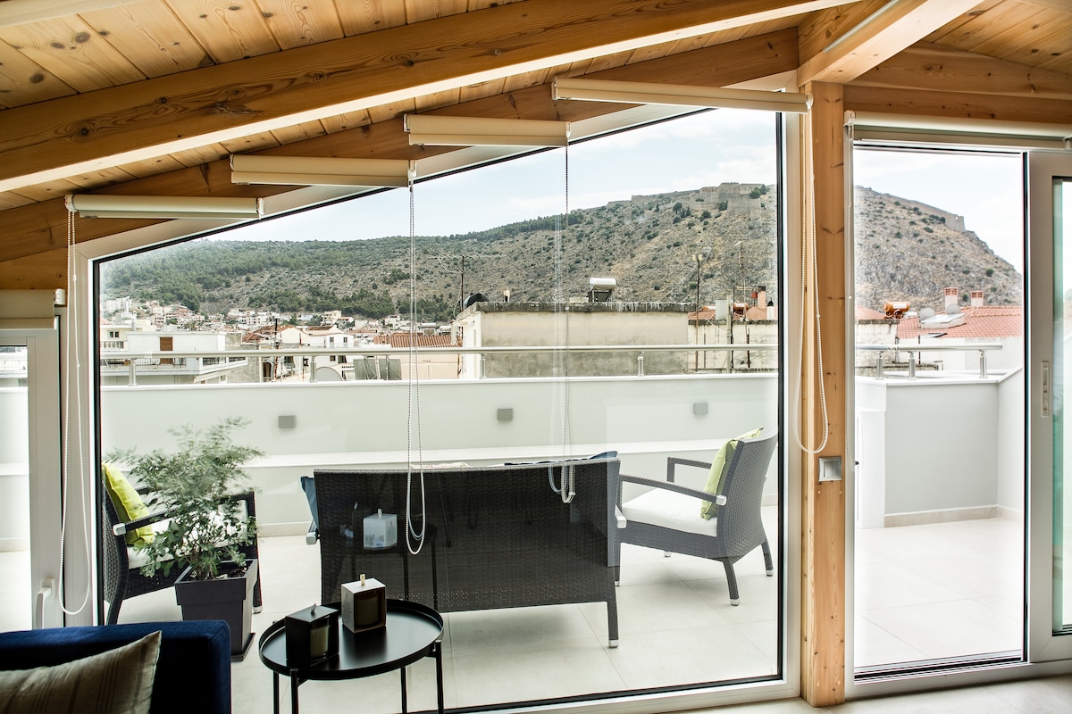 A modernly designed independent loft in the centre of Nafplio, with a private terrace of stunning view. The property overlooking the Castle of Palamidi and the area of Akronafplia is a 10-minute walk from the old town. Perfect for couples or professionals who would like to explore Nafplio and the surrounding historical areas. Ideal for relaxation and meditation.
