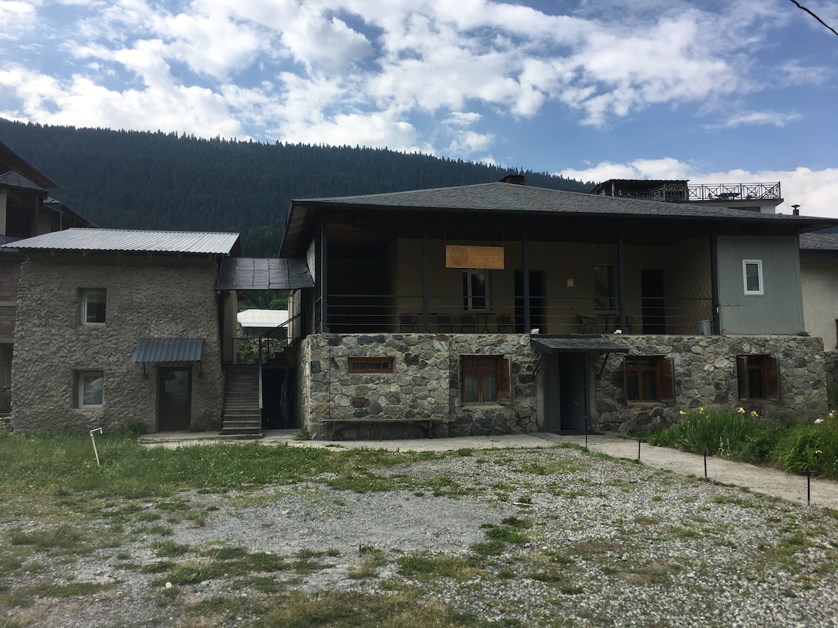 The hotel is located in Svaneti, in the village Chuberi, Mestia Municipality. The hotel has 5 double, 1 quadruple and 1 single rooms. There are also two cottages, which can accommodate 5 people and in contrast to the hotel rooms h a fully equipped kitchen.