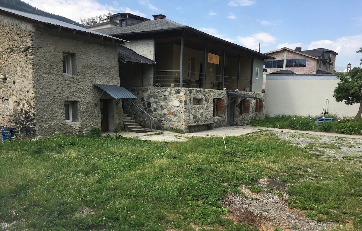 The hotel is located in the center of Mestia near the central park, with views of the mountains and towers, the hotel is cozy and convenient, with a large yard and its own parking, the hotel has 10 rooms for guests,
