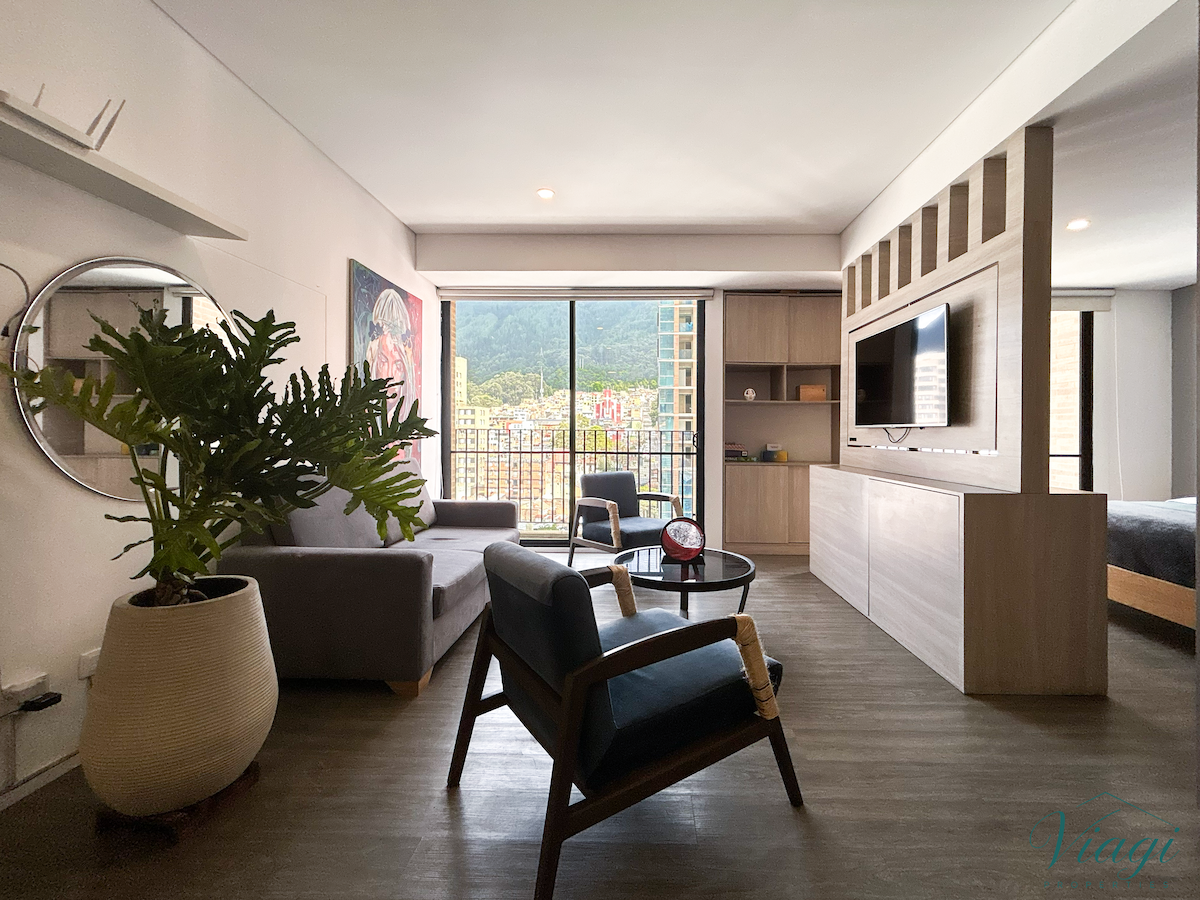 Moderno apartaestudio en los cerros orientales, al norte de Bogotá, jacuzzi con vista panorámica a la ciudad. Ubicado cerca del centro empresarial North Point, en un conjunto moderno, seguro y completo, con terraza BBQ, gimnasio, ping pong, co-working y zona de boxeo. Además, comercios y bancos cercanos. Un refugio de lujo en un entorno urbano exclusivo.