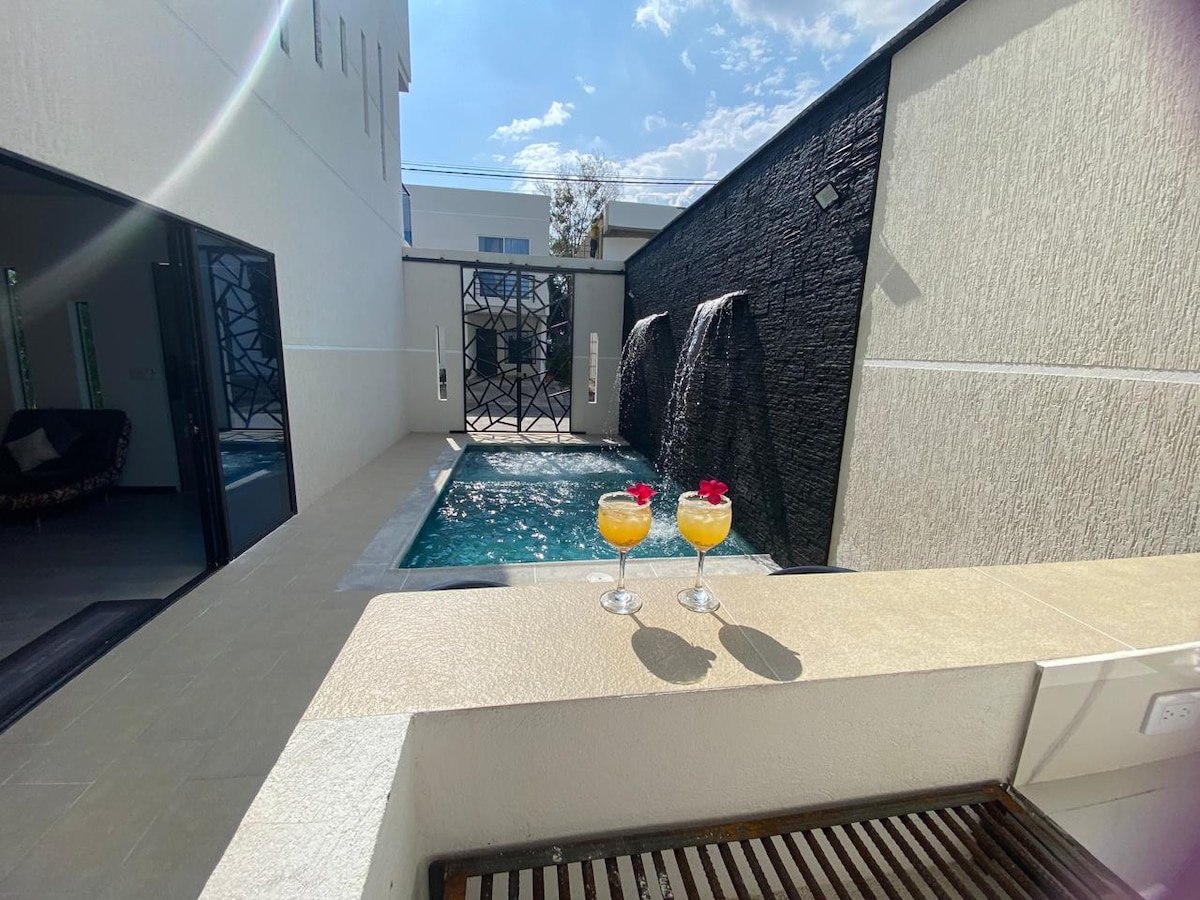 GREEN HOUSE vive una experiencia única entre confort y elegancia! Conectando con la naturaleza Disfruta de un primer piso totalmente independiente, entrada autónoma y parqueadero Piscina, jacuzzi con hidro-masajes, BBQ, baño y ducha al aire libre con puerta ventana de acceso a la sala Habitación principal cama extra doble con baño privado 2 Habitaciones con cama nido extra doble acomodación múltiple Baño social Cocina equipada con barra americana Sofá cama Office home Todo privado