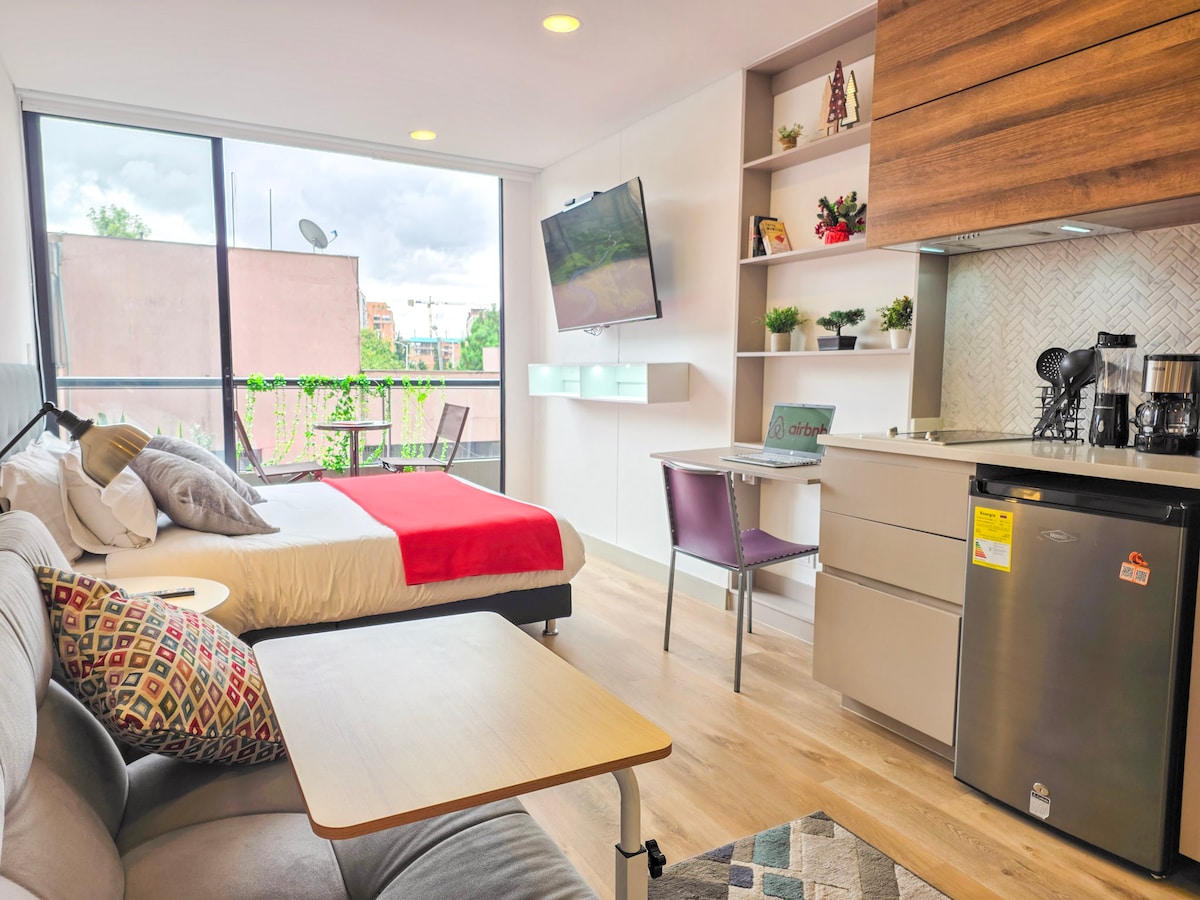 Loft moderno y luminoso, con balcón y vista al atardecer, ideal para ejecutivos, nómadas digitales y parejas. Cuenta con cocina equipada (airfryer, nevera, prensa francesa, estufa, etc.), Wifi, monitor externo, proyector con juegos retro y acceso a Netflix, HBO, Disney+ y más. El edificio ofrece rooftop 24/7 con vista 360°, zona de BBQ y yoga, gimnasio, coworking y zona de juegos, en una ubicación privilegiada cerca de Parque de la 93, Zona T y principales vías y estaciones de TransMilenio.