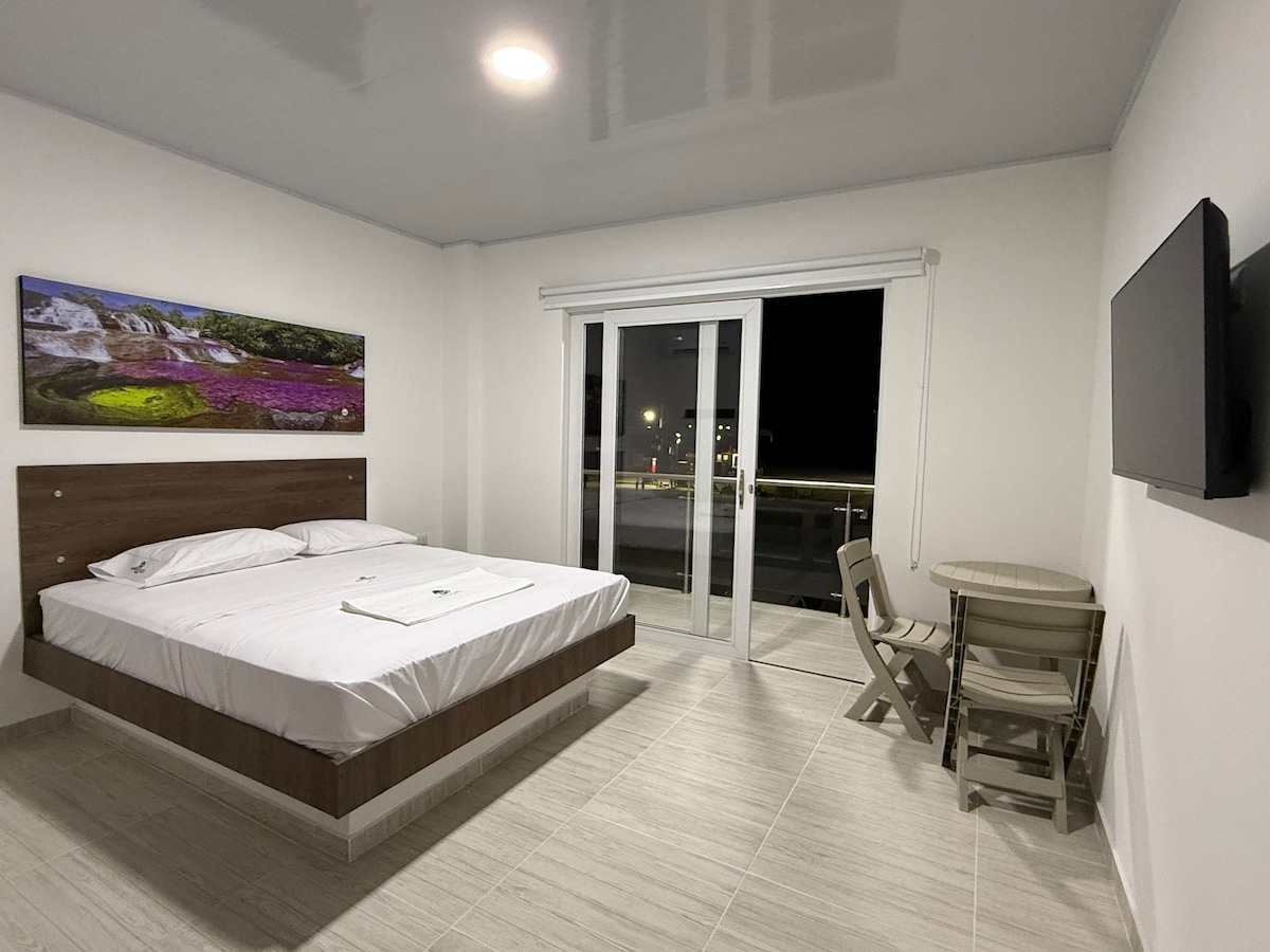Este amplio y luminoso apartaestudio consta de un solo ambiente, tiene espacio hasta para cuatro personas y consta de una cama amplia, un cómodo sofá con TV digital e internet WiFi, una espacio de café y nevera . Espacio para guardar tu ropa.