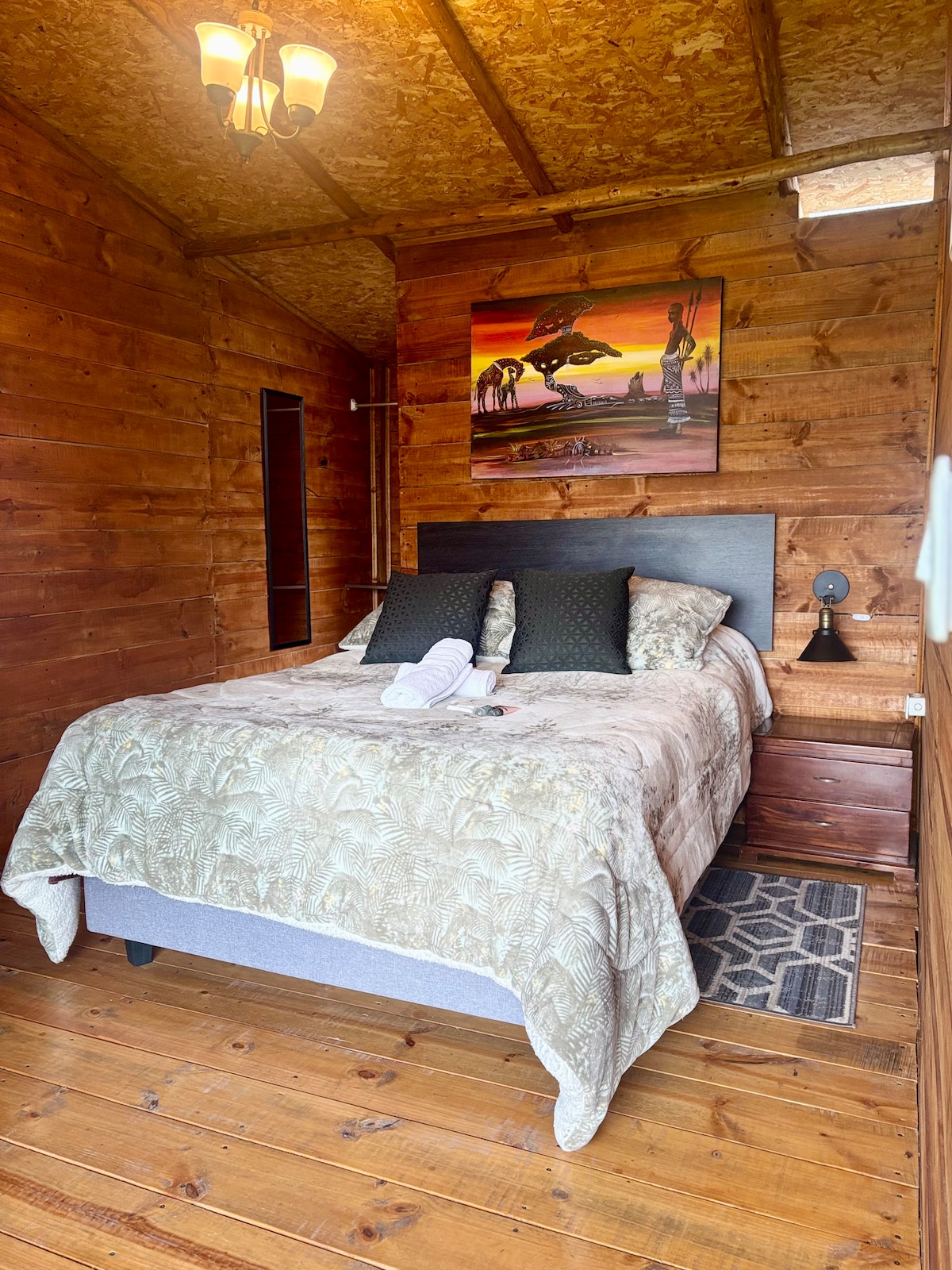 Cabaña independiente, dotada con 2 camas individuales, cama principal QUEEN y cama auxiliar tipo nido tamaño DOBLE. Baño privado con ducha y jacuzzi, artículos de aseo gratuitos, aire acondicionado, TV de pantalla plana, armario, zona de comedor y amplias zonas verdes y parqueo.