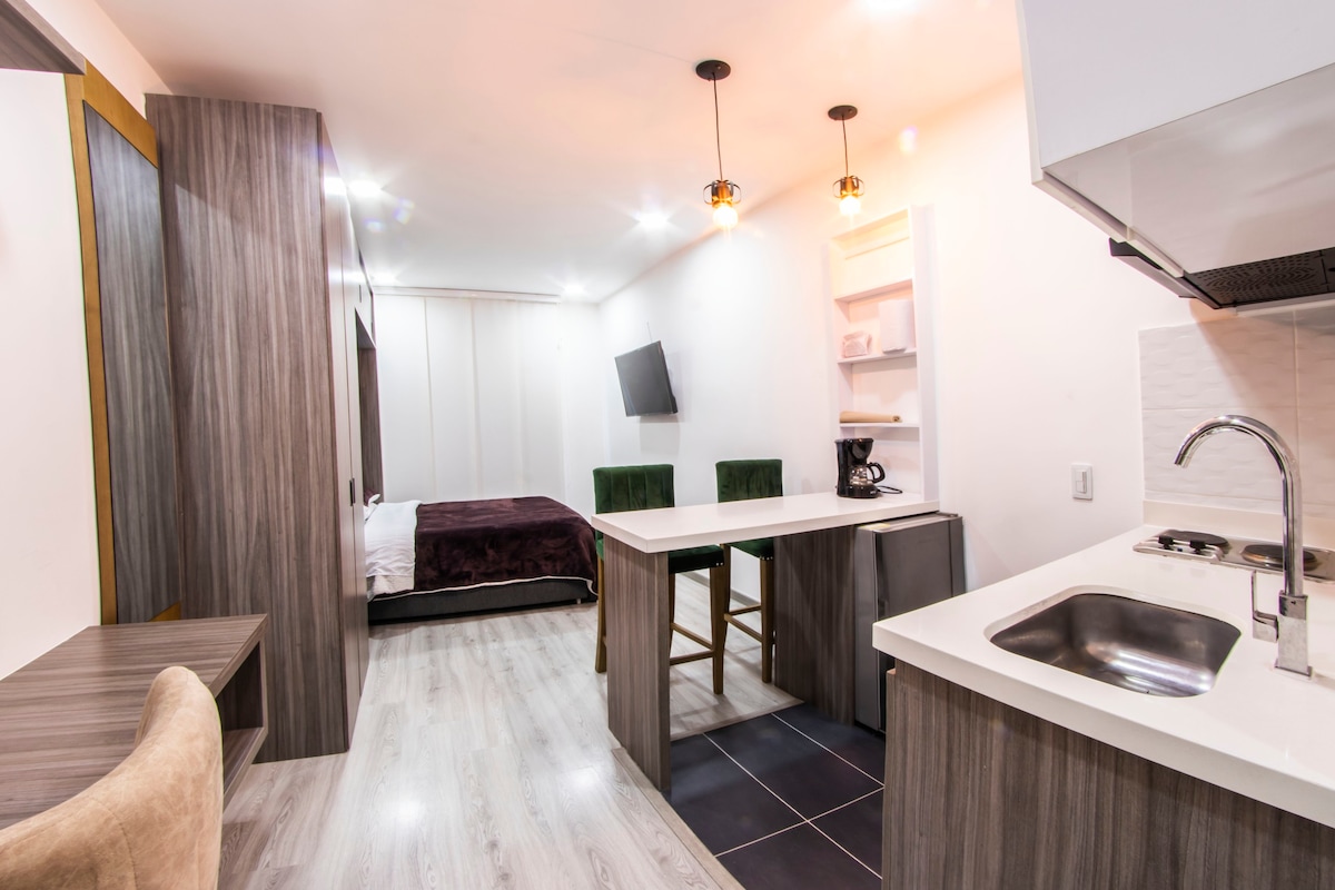 Aparta Estudio Full equipado, Ingreso con chapa digital inteligente. 24H de vigilancia y recepción.servicio de Wifi y Netflix. para que te sientas como en casa. Ubicado en Chapinero una zona extrategica de la ciudad con facilidad de transporte publico, cerca de centros academicos, supermercados, zonas financieras,centros comerciales, sitios turisticos, estadio el Campin, Movitsar Arena y una alta demanda de gastronomía. También por un valor adicional sorprende con una linda decoración.