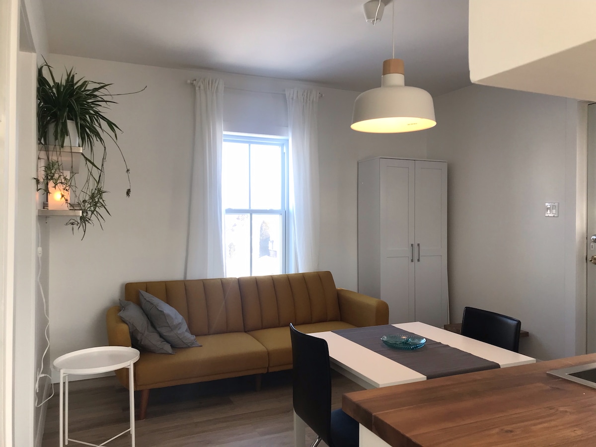 Grand studio complètement rénové à neuf. Très bien situé sur l’artère principale de la ville. Près de tout. Lit queen matelas mousse mémoire. Télévision intelligente, internet et cable inclus. 2 portes de garage qui agrandissent l’appartement sur un grand balcon. Look industriel au goût du jour. Cuisine très fonctionnelle et bien équipée. Beaucoup de commodités fournies sur place. Salle de bain avec concept de douche unique toute en céramique. Aucunes portes et fenêtres sur le boulevard