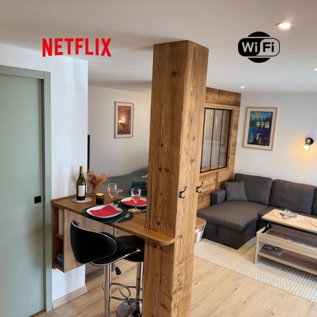Pagotin tout confort refait à neuf 35 m², petite cour, Poêle à pellets Idéal 2 adu + 2 enf Proche commerces, pistes, cinéma , air de jeux Cuisine équipée, canapé convertible 2 places Chaise haute, lit parapluie Chambre à l'étage 1 lit 180x190 + 1 lit 90x190 Local skis. Parking ext. gratuit Option ménage sur demande (de 20 à 45 euros selon la durée du séjour) Wifi fibre Caution 300 euros (restitution fin de séjour)