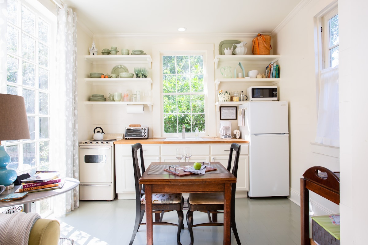 Clementine's Room is a lovely hideaway in Mid City on Bayou St. John. It is simply a bedroom/bath with tile shower, washer/dryer, and king bed. The door is next to a gazebo for outdoor time and the desk can be arranged for 2 to dine inside. There is a large Roku tv for streaming shows, a mini-fridge, microwave, electric kettle & coffee funnel for making morning coffee or tea, and dishes & flatware for heating up a snack. Also, it can be combined with our Sweet Suite for 2bed/2bath family booking