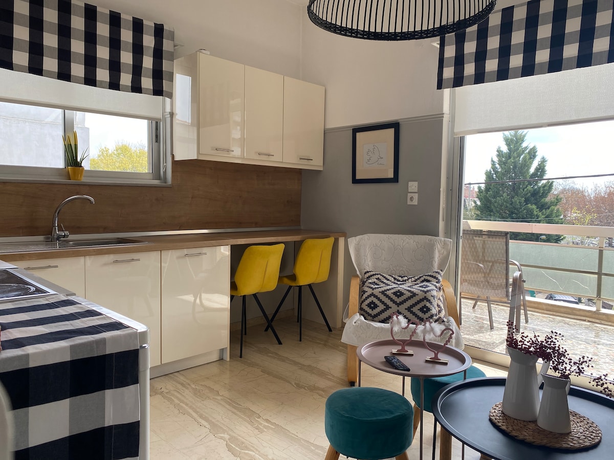 This stylish and sunny apartment of 100m2 is situated in the Old town of Kalampaka. It is located in a beautiful scenery surrounded by trees with a breathtaking terrace view of the famous Rocks of Meteora!By staying here you have great access to Kalampaka's shopping area (restaurants, bakery shops,coffee shops, banks, post office etc.) as it is only 5 minutes away from the town's center. It is in a quiet neighbourhood convenient for reaching out the best spots of Kalampaka even exploring Meteora on foot! The key position, the professional cleaning and the elegant decoration makes it suitable for every guest.