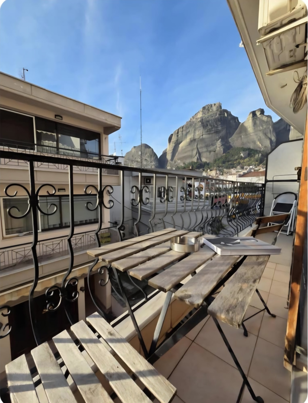 Το διαμέρισμα βρίσκεται στο κέντρο της πόλης, με καταπληκτική πανοραμική θέα στα Μετέωρα. Υπερσύγχρονο και καλαίσθητο, φτιαγμένο με τα πιο σύγχρονα και πολυτελή υλικά, παρέχει στον επισκέπτη μια μοναδική διαμονή, ενώ διαθέτει μια πολύ μεγάλη βεράντα με θέα που θα κάνει τη εμπειρία της διαμονής αξέχαστη.