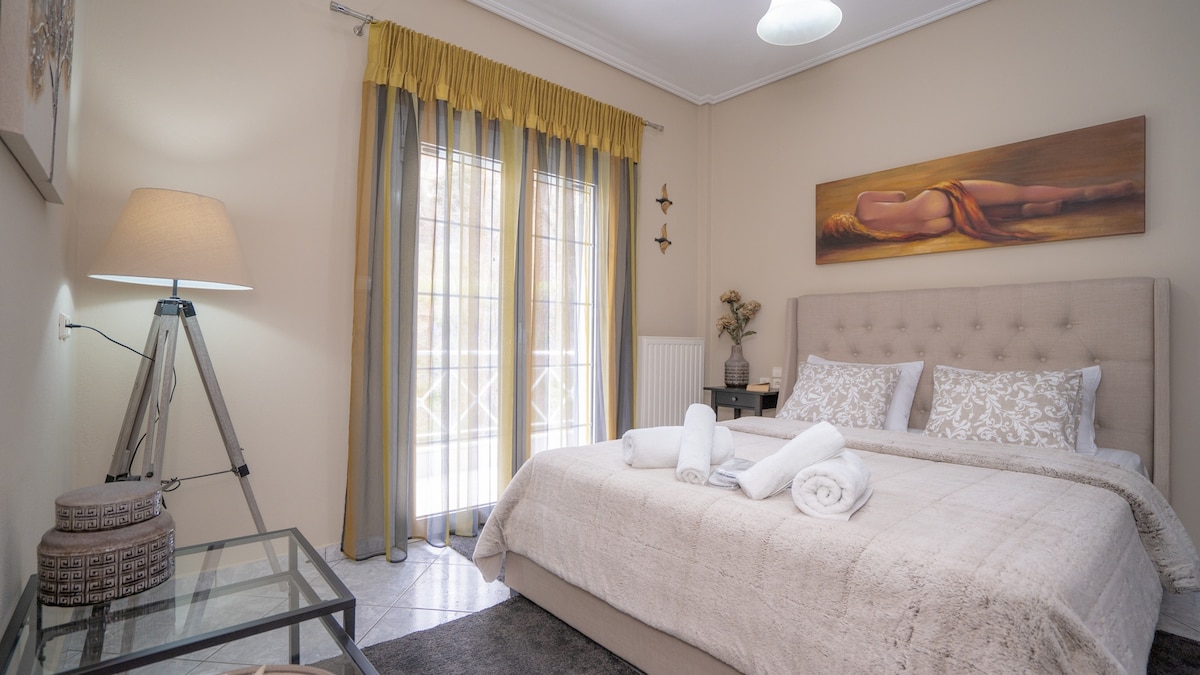 The apartment is located at the very center of Kalampaka.Only 200m from the Train and Bus Terminal. Plenty of restaurants, super market and nightlife places are accessible at a walking distance. Each bedroom is equipped with a queen-size anatomical mattress, quality bedsheets,aircondition and flat-screen TV. Amenities,towells and slippers are provided. Some breakfast supplies and welcome drink can be found in the fully equipped kitchen. P.S. Enjoy Meteora View from both living room and balcony.