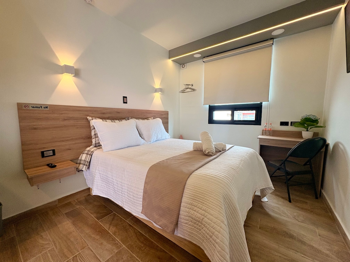 Suite ejecutiva estilo hotel con diseño elegante y minimalista, ideal para trabajo o descanso. Cuenta con WiFi de alta velocidad, área de trabajo, cama confortable, Smart TV 4K con Netflix y ViX, cocineta con microondas y frigobar, baño premium y cortina Black Out. Acceso autónomo con chapa digital. Ubicada entre Toluca y Metepec. IMPORTANTE: no cuenta con estacionamiento ni es posible dejar autos afuera al encontrarse dentro de una privada.