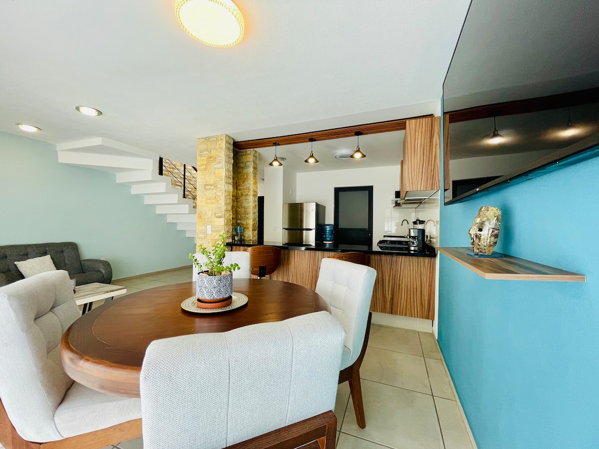 Bienvenidos a tu refugio de inspiración. Nuestro departamento combina comodidad y diseño minimalista y moderno en una ubicación ideal para una experiencia tranquila, segura y muy centrica. Disfruta de espacios cómodos y pensados para tu bienestar, creando una atmósfera perfecta para tu descanso y para la productividad. Relájate con un té o café cada mañana, o prepara un delicioso desayuno en nuestra cocina equipada. ¡Te esperamos para una estancia memorable!