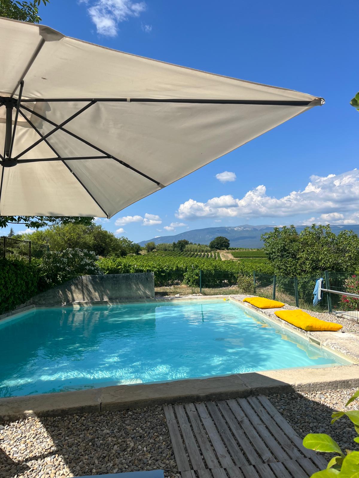 This apartment of 40m² is part of a large farmhouse where two spaced accomodations are rented seasonally. We, the owners, Axelle and Frédéric, also live on the premises. Dating from the 19th century, the farmhouse is at the core of a 20-acre vineyard right below the Mont Ventoux. A renovated 1-meter-deep pool of 50 m² offers a breathtaking view of the "Géant de Provence". The apartment is fully equipped for your comfort, bedding and towels included. You'll be able to park in front of the place.