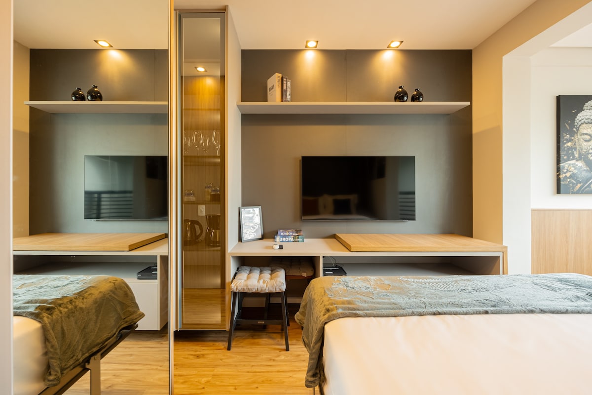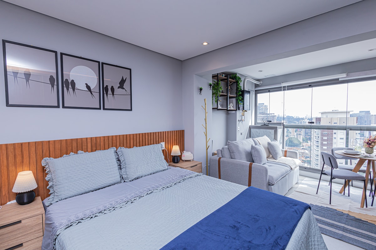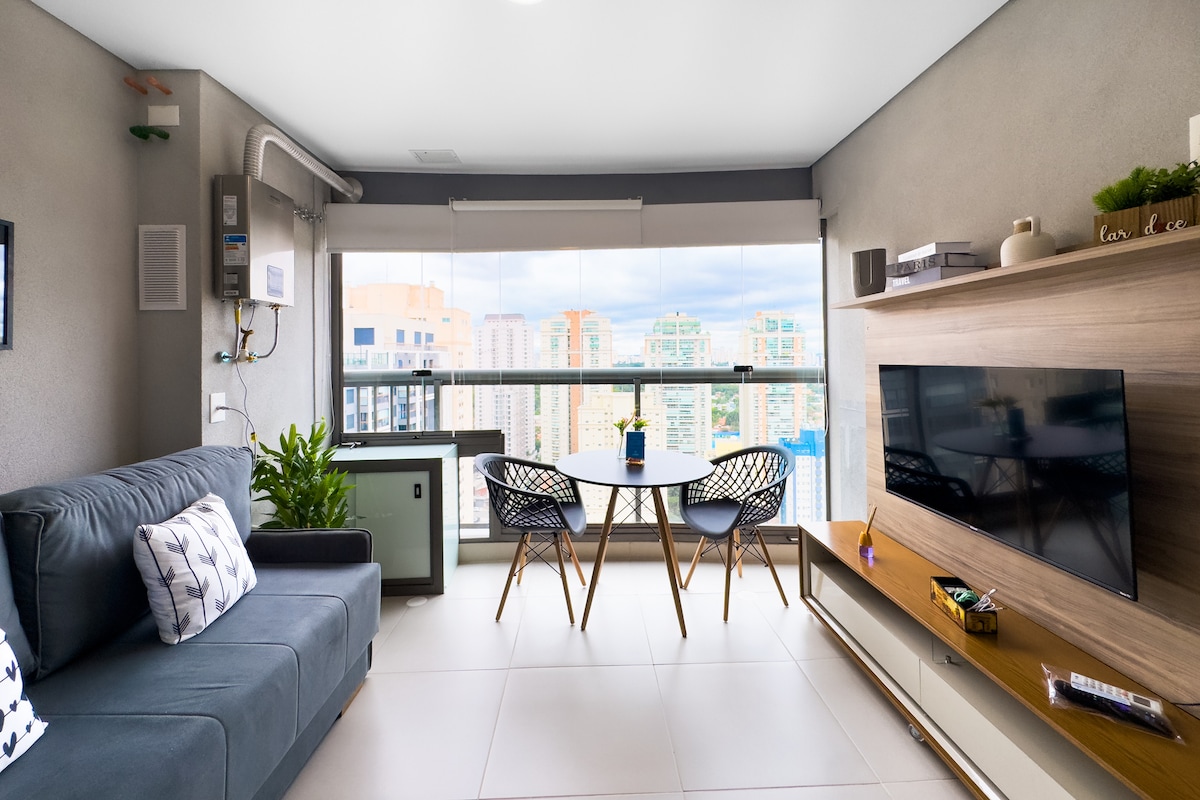 Enjoy a brand-new, modern, and beautifully decorated apartment with a stunning view. Instead of a cramped studio, you’ll have separate spaces that accommodate up to 4 guests. Conveniently located next to the Brooklin station and close to Moema, Pinheiros, Berrini, the U.S. Embassy, and Congonhas Airport, in a quiet and safe street. The building offers amenities like a gym, pool, sauna, and coworking space, as well as excellent restaurants, a supermarket, and a pharmacy right at your doorstep.