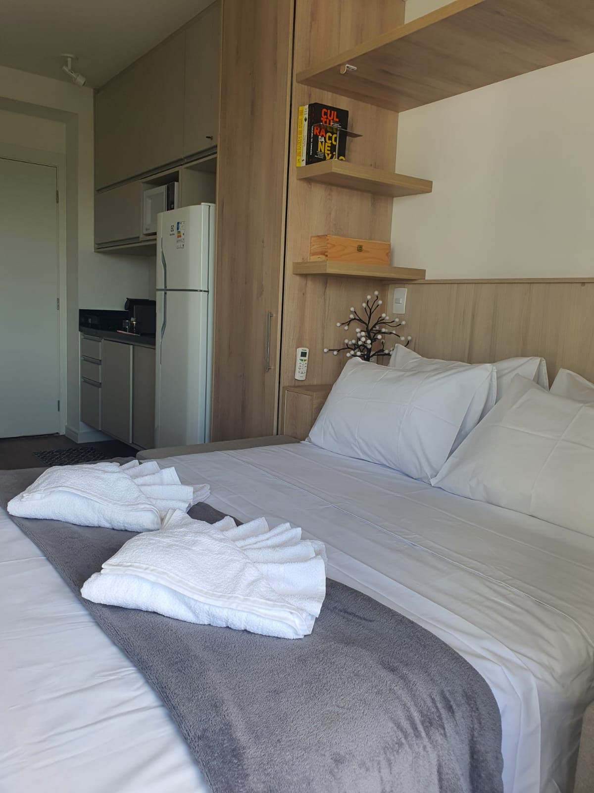 O que o studio oferece: - Cama de casal com colchão confortável - Wi-Fi rápido e Smart TV - Ar-condicionado - Cozinha equipada com cooktop, depurador, microondas, frigobar, cafeteira dolce gusto, airfryer e utensílios - Enxoval completo (cama, banho, panos de prato e de chão) - Banheiro com chuveiro quente, box de vidro, ducha higiênica e aquecedor de toalhas - Varanda privativa com mesa e aparador - Ferro de passar