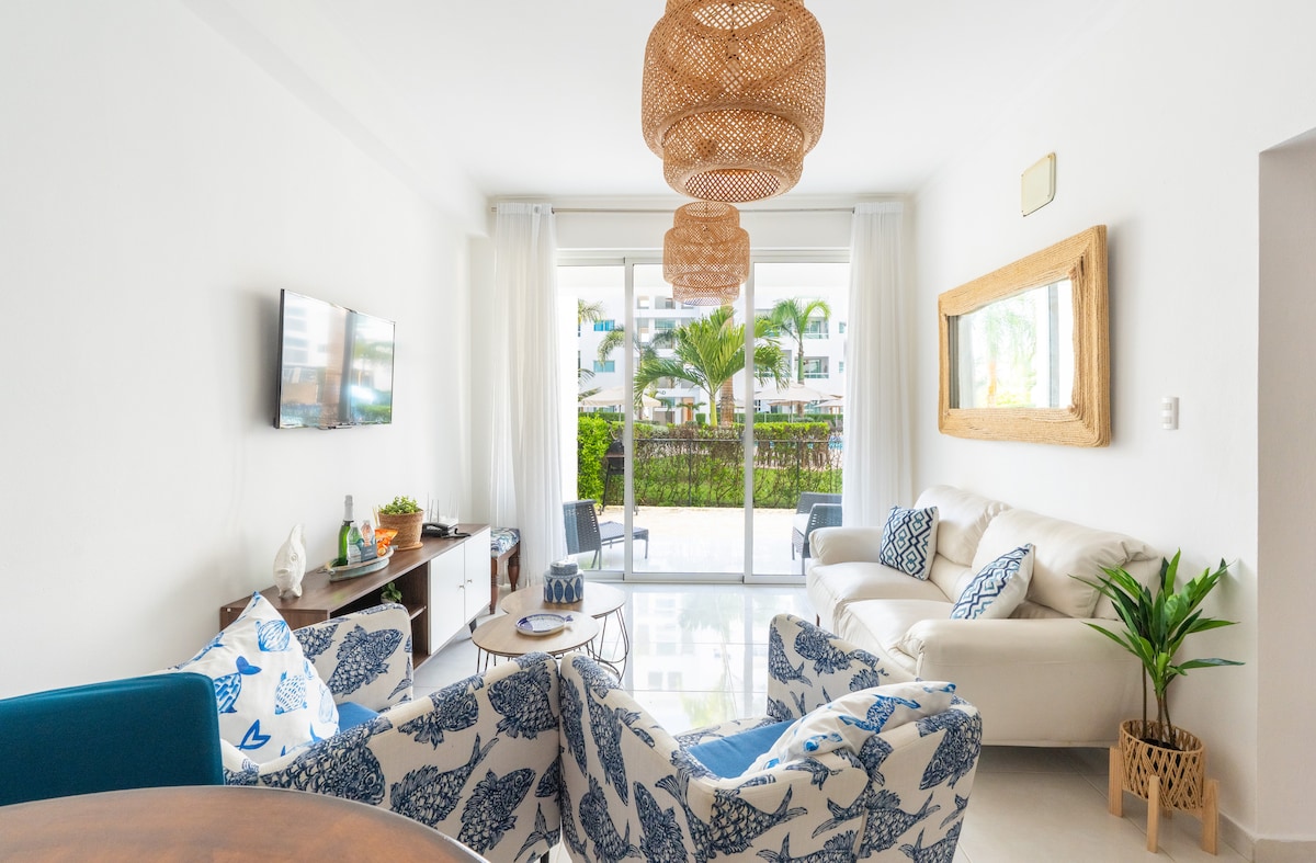 Apartment inside the Guavaberry Golf Club Resort. It has everything you need for a short or long stay: three bedrooms, access to a large pool, a playground, and a gym. There is also a restaurant within the complex, everything you need for a wonderful stay in the Juan Dolio area. We allow up to 6 adults + 3 children / Permitimos hasta 6 adultos y 3 niños.